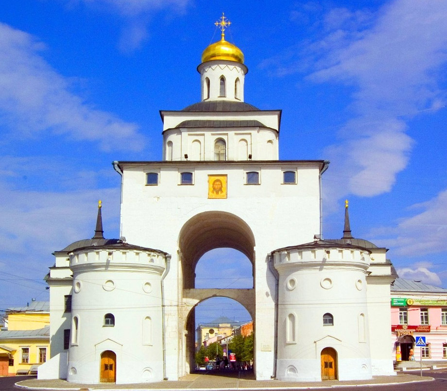 Как твердыня, высятся Золотые ворота Владимира (1164 г.), одновременно служившие городу и узлом обороны, и торжественным въездом. Их мощный белокаменный куб, прорезанный огромной аркой и высоко увенчанный златоглавой церковью, — замечательное сооружение крепостной архитектуры.