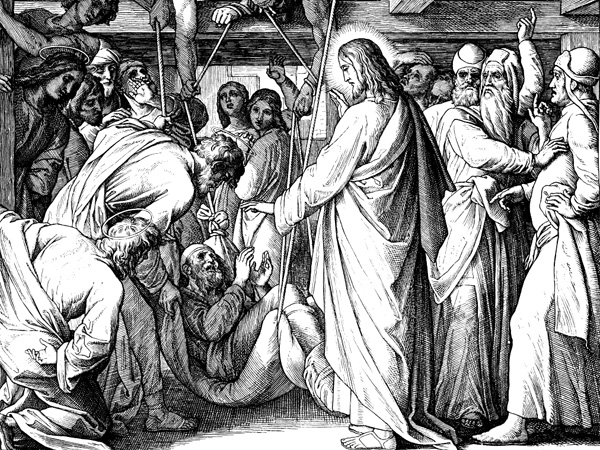 Присутствующие при этом книжники и фарисеи стали мысленно осуждать Иисуса за богохульство, видя в Его словах незаконное присвоение Себе власти, принадлежащей лишь Единому Богу. Господь же, зная помышления их, дал понять им, что Ему известны их мысли, сказав: "Что легче сказать: прощаются тебе грехи или сказать: встань и ходи?" Видимо, как для одного, так и для другого нужна одинаковая Божественная власть.