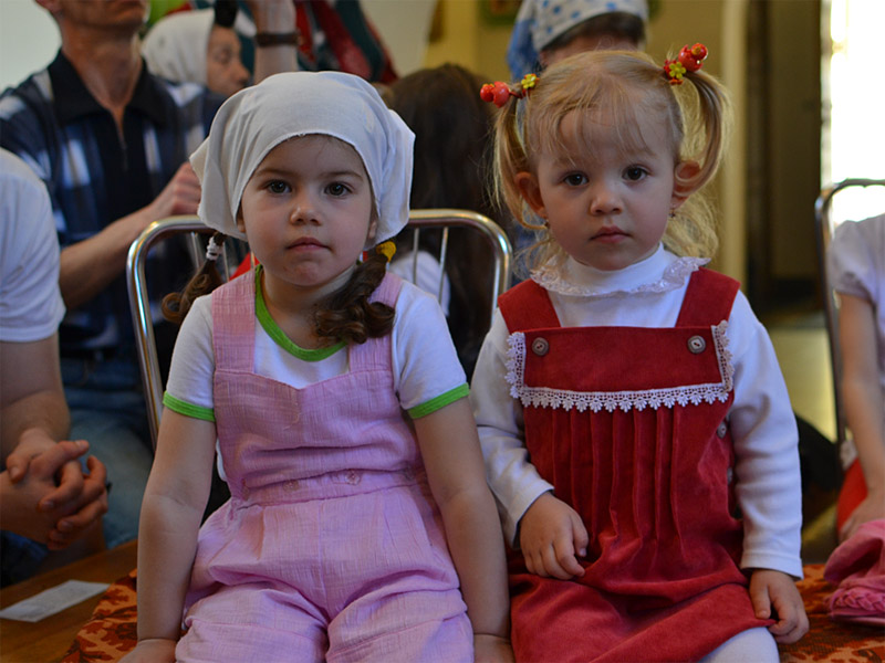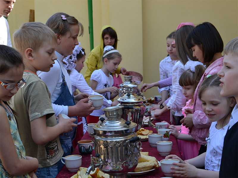 После окончания концерта для детей воскресной школы во дворе храма был организован стол со сладостями и чаепитием.