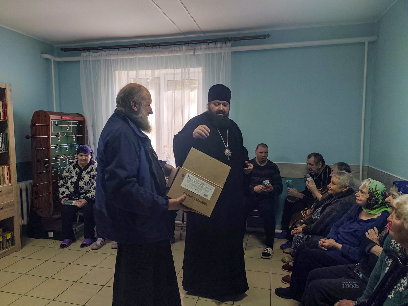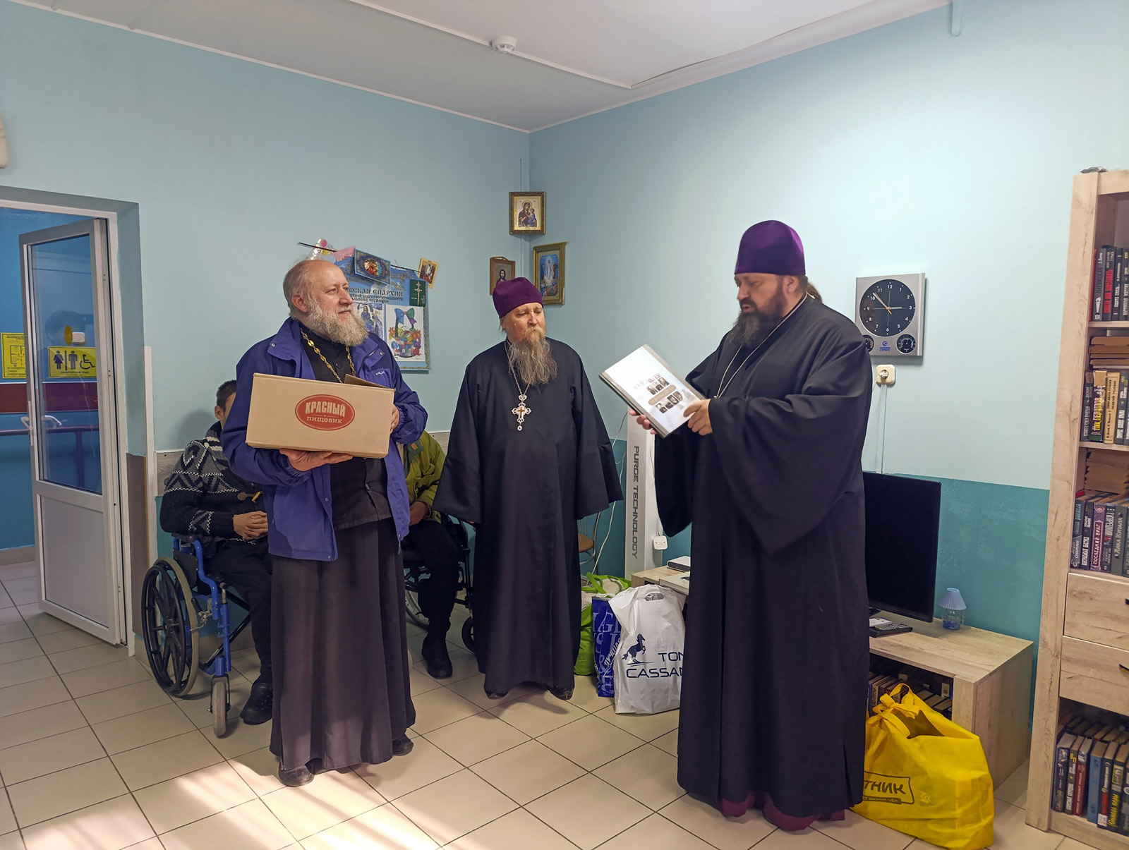Владыка сердечно поздравил всех проживающих с праздником, выразил глубокую благодарность и искреннее уважение старшему поколению, тепло пообщался с присутствующими и ответил на их вопросы. По завершении душевной беседы Его Преосвященство передал в библиотеку отделения книги нового издания и вручил каждому проживающему сладкие подарки.