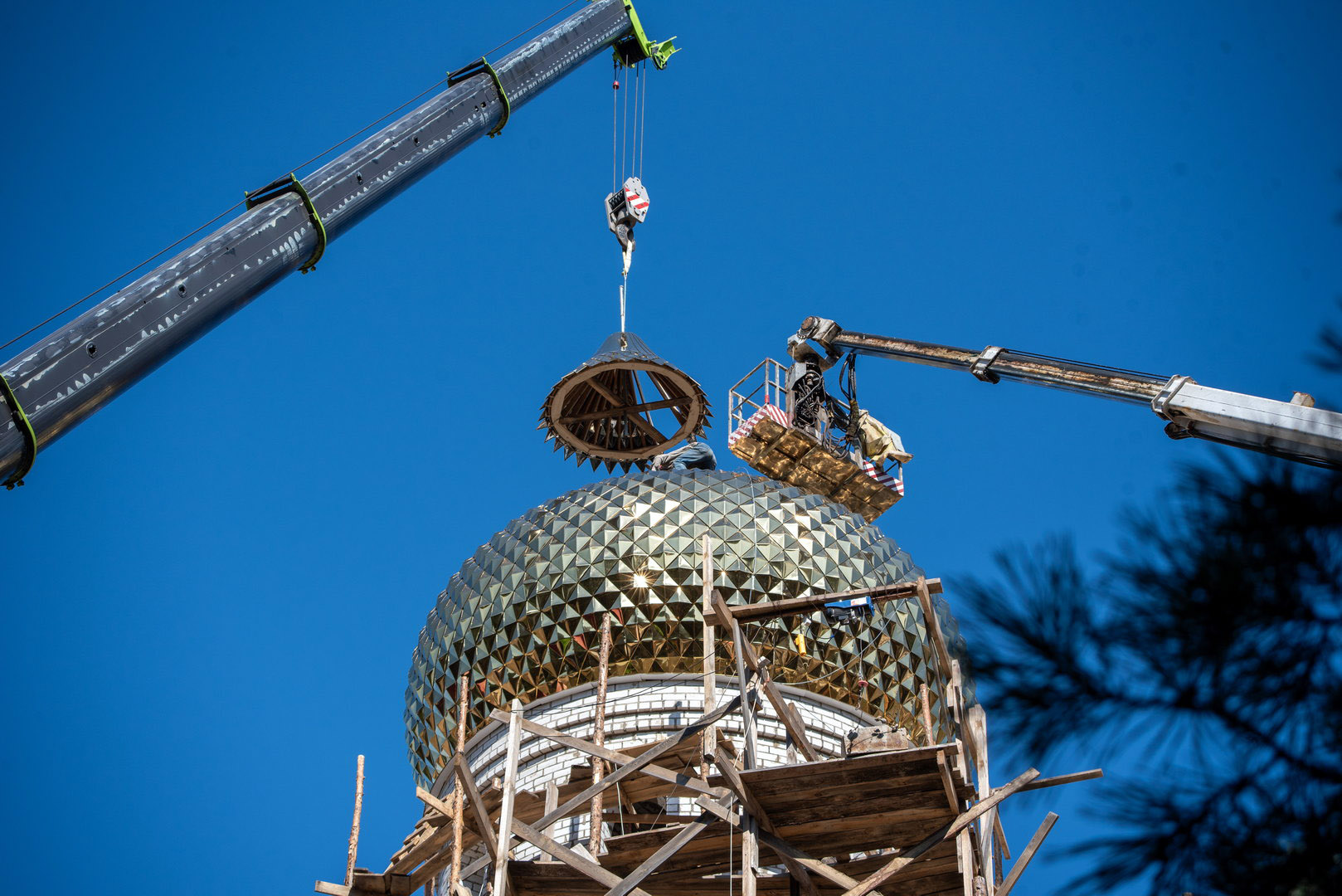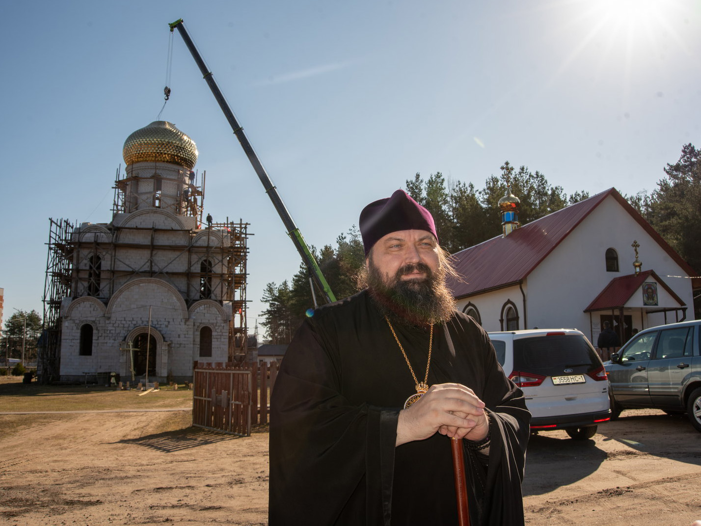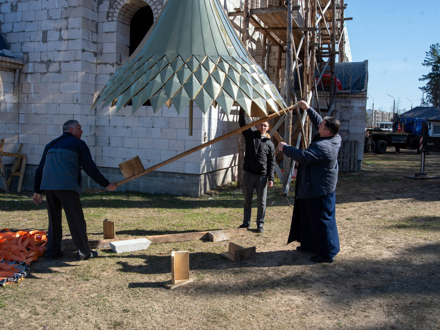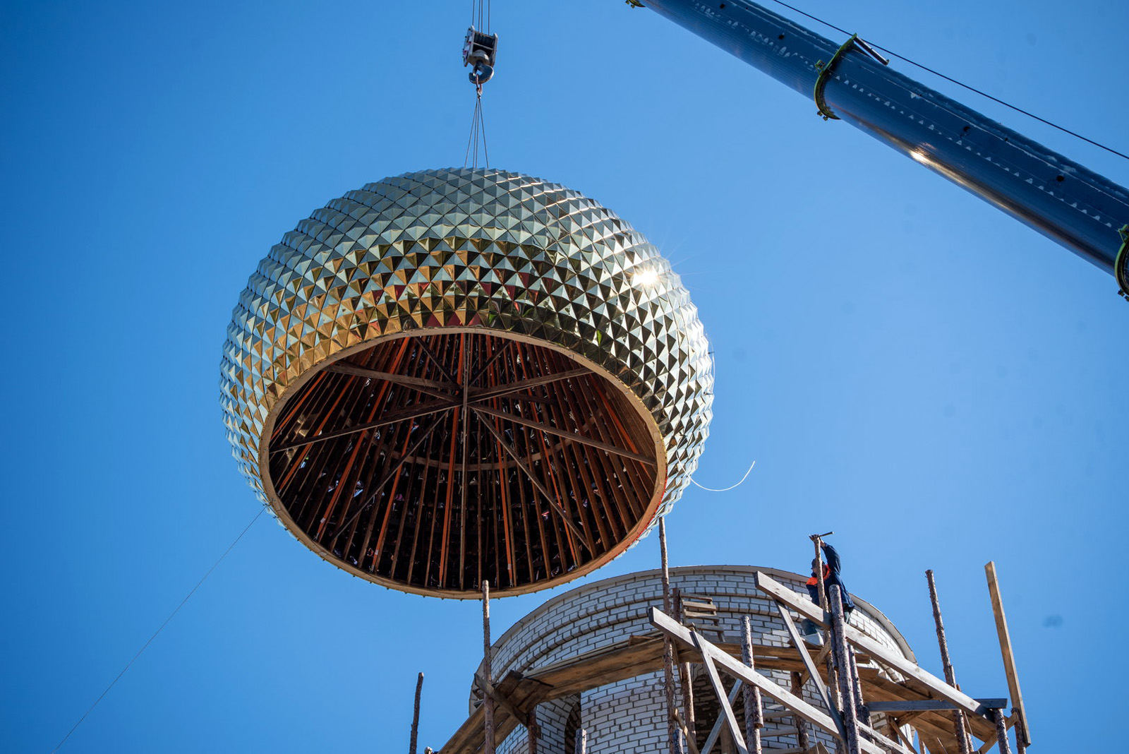 Купол изготовили в Бегомле мастер и его сын. Его высота составляет практически восемь метров. Купол весом в три тонны поднимали на 30-метровую высоту с помощью спецтехники. Высота храма вместе с куполом и крестом составит 33 метра.