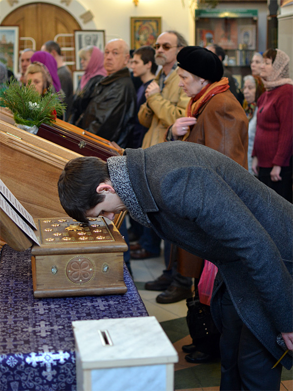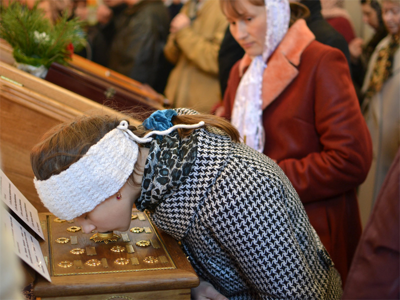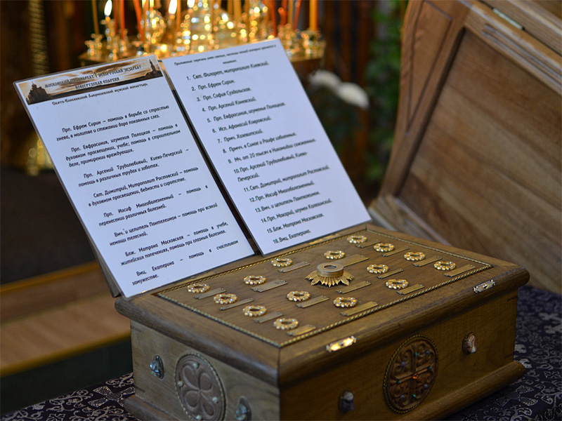 Сегодня множество православных верующих пришли, чтобы поклониться им и получить от них исцеляющую благодать. В ковчеге находятся частицы мощей Великомученика и целителя Пантелеймона, Блаженной Матроны Московской, Великомученицы Екатерины, Преподобного Ефрема Сирина, Святителя Филарета Киевского, Преподобной Софии Суздальской, Преподобной Евфросинии Полоцкой, Преподобного Арсения Коневского, Святителя Афанасия исповедника, Киево — Печерских святых, Преподобного Макария Колязинского.