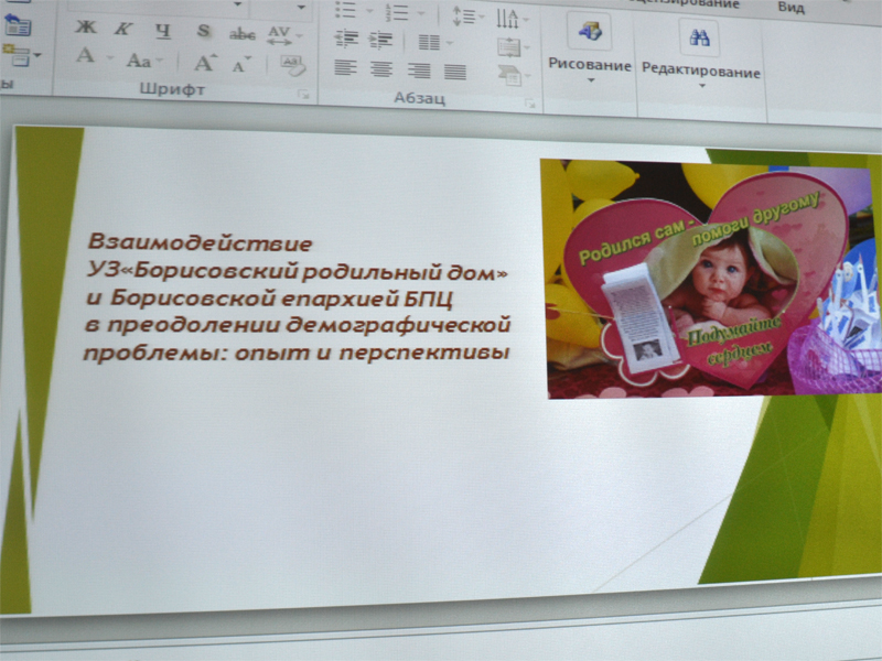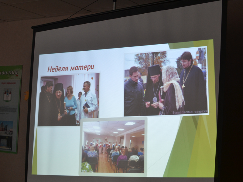 Вела семинар психолог родильного дома Русанова Екатерина Дмитриевна. Участников семинара приветствовал главный врач роддома Шипуло Александр Валерьевич. В своем выступлении он отметил важность обсуждаемого вопроса, рассказал о демографической ситуации в районе, о работе учреждения по профилактике и преодолению ее последствий. На семинаре-практикуме выступил благочинный 1-го Борисовского церковного округа, настоятель прихода храма Рождества Христова г. Борисова протоиерей Александр Вербило. Основываясь на Священном Писании, он говорил о христианском понимании вопросов семьи и брака, о совместных мероприятиях роддома и благочиния в духовно-просветительской работе с молодежью, беседах и акциях по предотвращению и вреду абортов, проведению выставок в учреждениях образования «Выбери жизнь». Екатерина Дмитриевна Русанова остановилась на вопросах реализации совместных программ, проведении региональных семинаров с участием духовенства епархии, таких как «Межведомственный подход медицины, психологии, духовенства в преодолении демографической проблемы». В этих вопросах большую помощь оказывают духовник роддома, клирик кафедрального собора Воскресения Христова г. Борисова протоиерей Димитрий Дорошенко и клирик храма Рождества Христова г. Борисова иерей Григорий Барашко. «В настоящее время, - отметила Е.Д. Русанова, - разработана Межведомственная программа «Духовные и национальные традиции в воспитании культуры репродуктивного поведения». Ее целью является воспитание у подростков семейных ценностей на основе культурно-религиозных традиций православной семьи. Мы будем знакомить подростков с традиционными белорусскими семейными обрядами, осуществлять духовно-нравственное воспитание средствами национальной культуры, ориентировать молодежь на многодетность. Одной из важнейший задач этой программы является также установление новых направлений сотрудничества и партнерства в области духовно-нравственного и репродуктивного воспитания между учреждениями образования, здравоохранения, культуры и Борисовской епархией». Екатерина Дмитриевна призвала всех участников семинара активно включиться в работу по реализации программы.