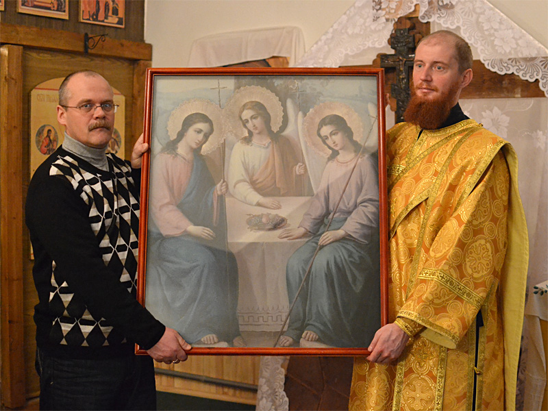 Затем протоиерей Александр Вербило поздравил протоиерея Иоанна Мироновича с Днем Ангела и от прихода храма Рождества Христова вручил ему для храма Иоанна Кронштадтского подарок — икону Святой Троицы.