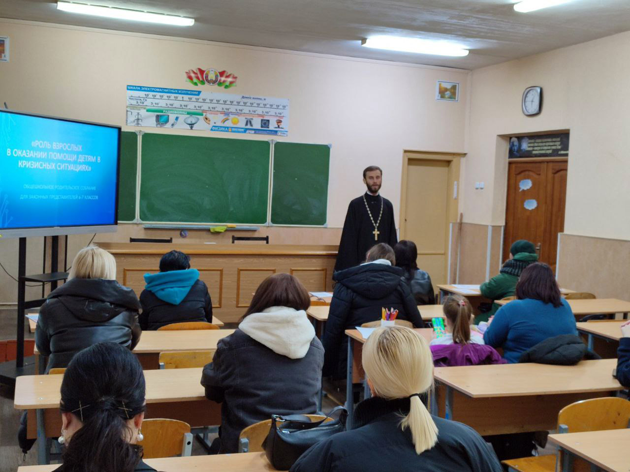 4 декабря клирик кафедрального собора Воскресения Христова г. Борисова иерей Дмитрий Качановский посетил школу №9 г. Борисова. Священнослужитель принял участие в собрании для родителей учащихся 6-7 классов и рассказал о роли взрослых в оказании помощи детям в кризисных ситуациях.