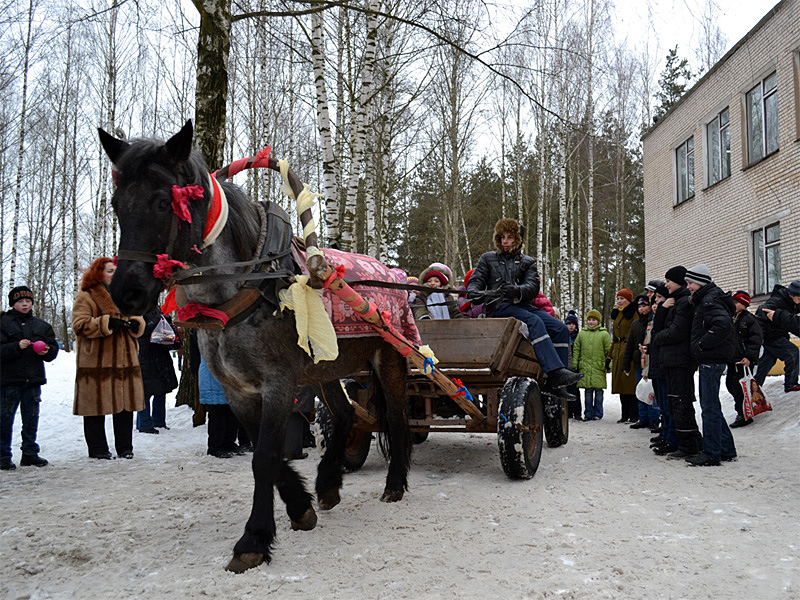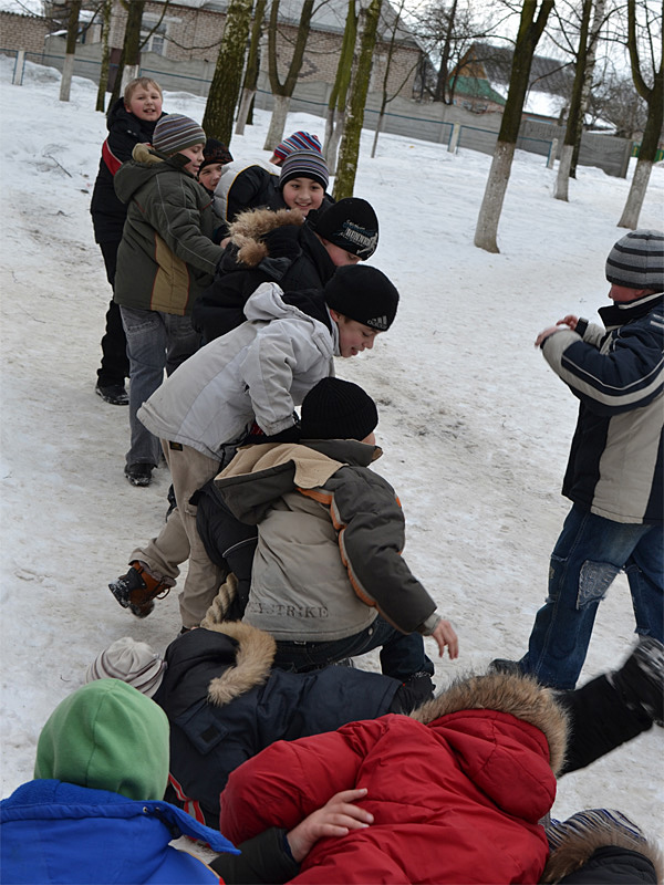 После того как все основательно подкрепились, праздник продолжился на школьном дворе, где было установлено традиционное чучело зимы. Дети пробовали свои силы в дартсе, перетягивали канат и просто играли в снежки. Особую радость у детей вызвало появление на празднике лошадки с повозкой, на которой с удовольствием прокатились все желающие.