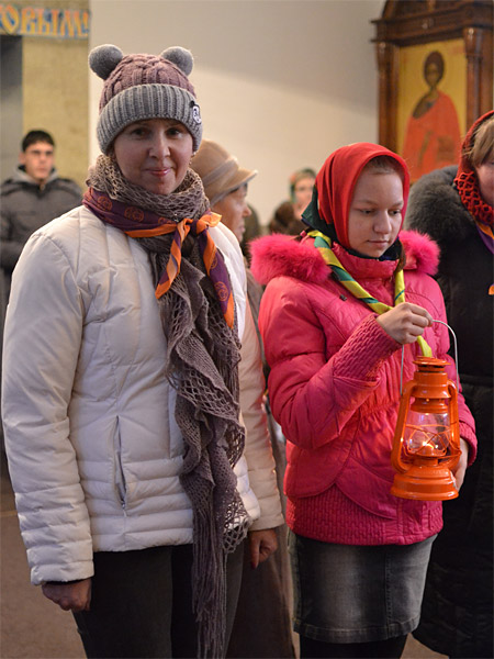 «Стало уже доброй традицией, — сказала региональный комиссар Минского областного отделения гайдов Наталья Сорочинская, — когда скауты приносят этот огонь из пещеры Вифлеема. Австрийские скауты начинают эту акцию, которая соединяет молодежь всего мира. И этот огонь через границы различными способами перевозят молодые люди в храмы. Мы очень рады, что в этот год в очередной раз, начиная с 2006 года, гайды привозят огонь на Борисовщину. Это не просто огонь, это символ мира, символ дружбы, но и возможность прийти в церковь и принести эту частичку радости всем людям, прихожанам нашего храма».