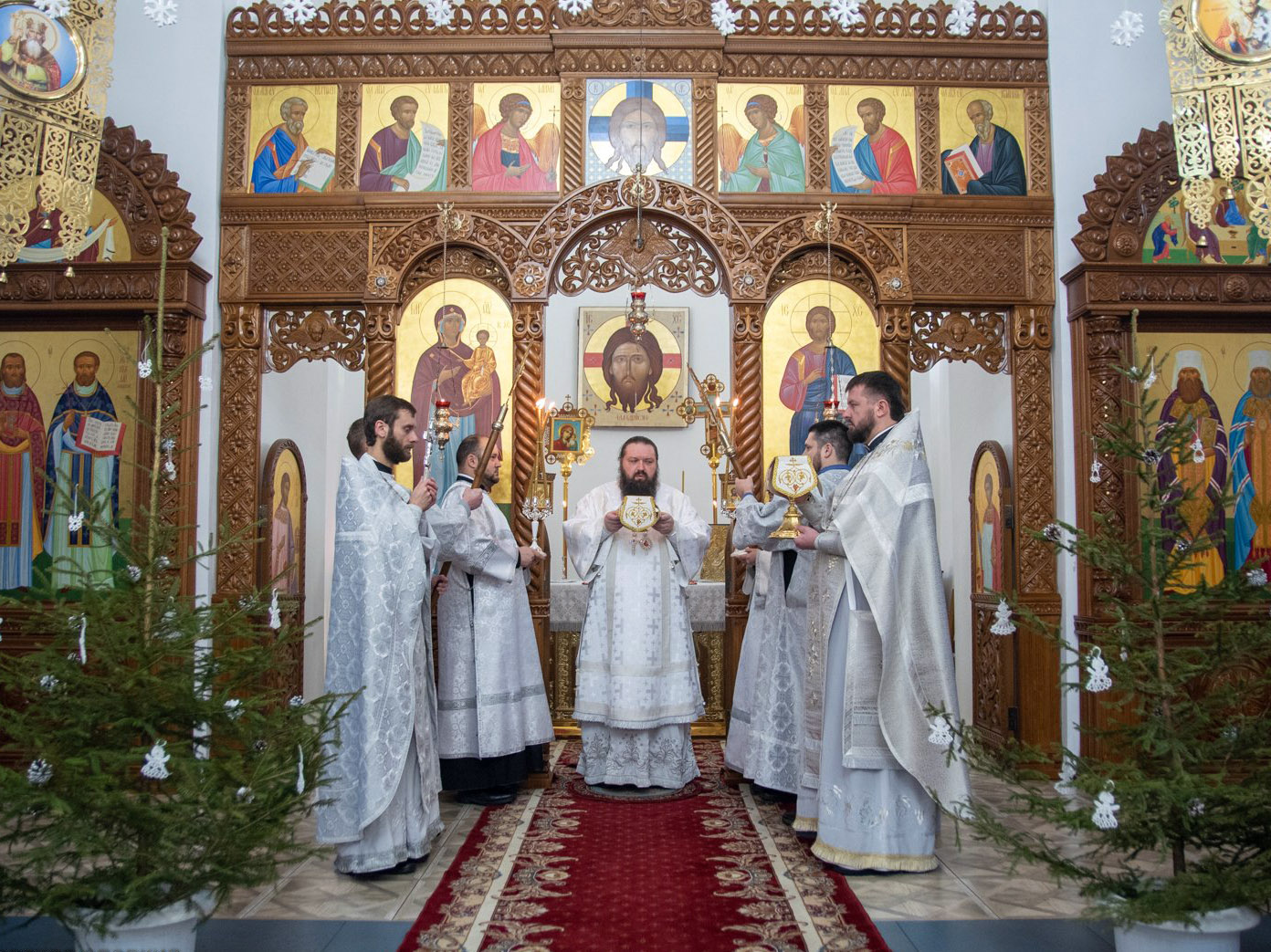 В завершение Литургии перед Рождественской свечой, знаменующей Вифлеемскую звезду, были пропеты тропарь и кондак праздника Рождества Христова.