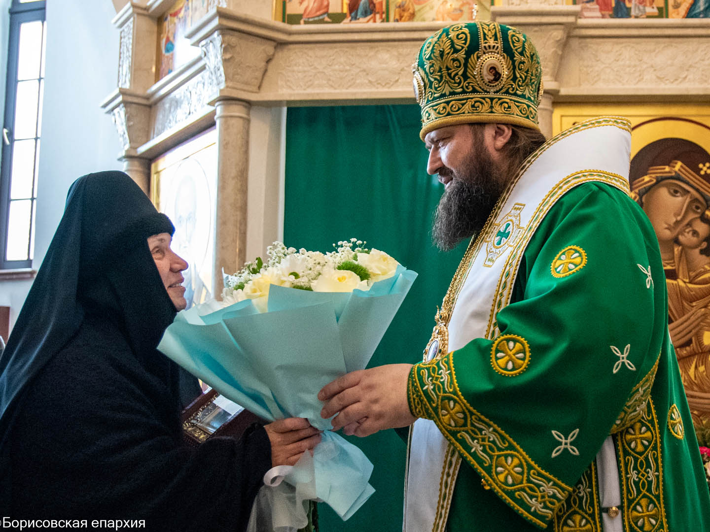 Затем владыка обратился к духовенству, сестрам обители и паломникам с архипастырским словом, после которого поздравил игуменью Евпраксию с прошедшим днём тезоименитства и преподнёс ей на молитвенную память икону Пресвятой Богородицы и букет белых цветов.
