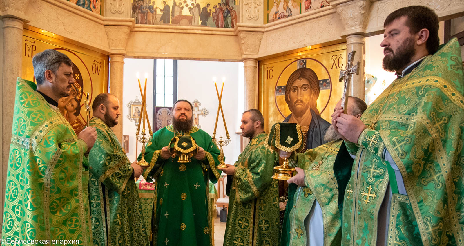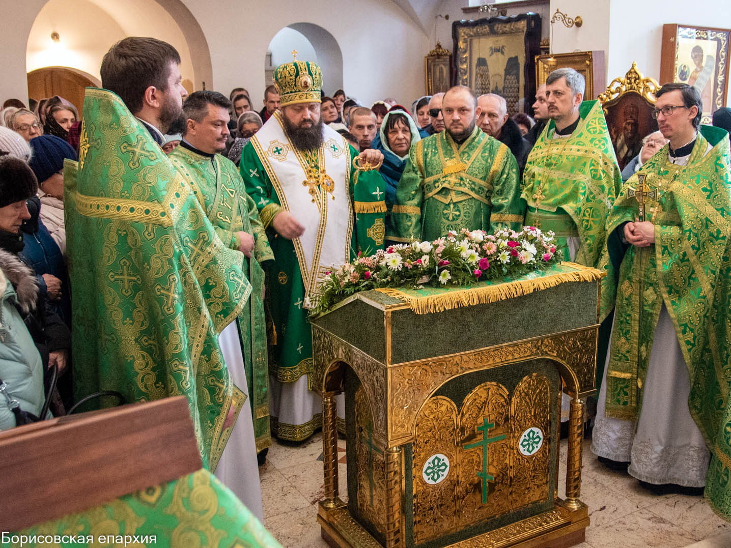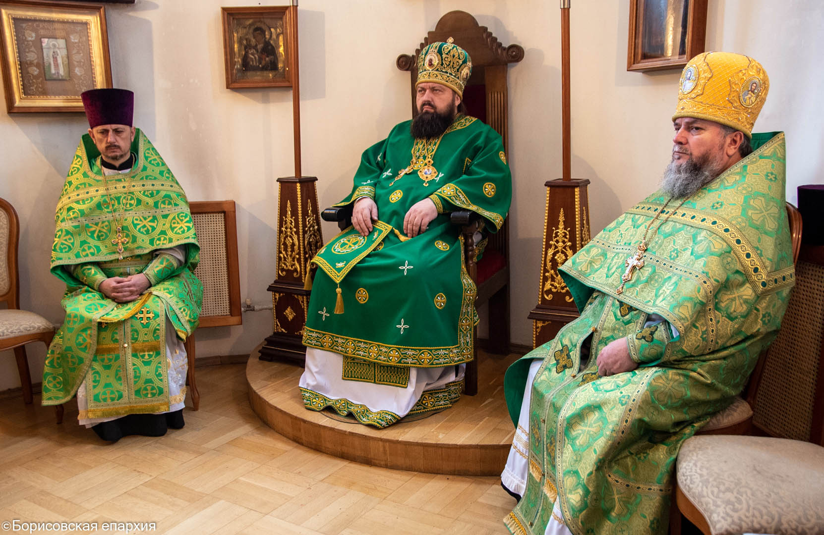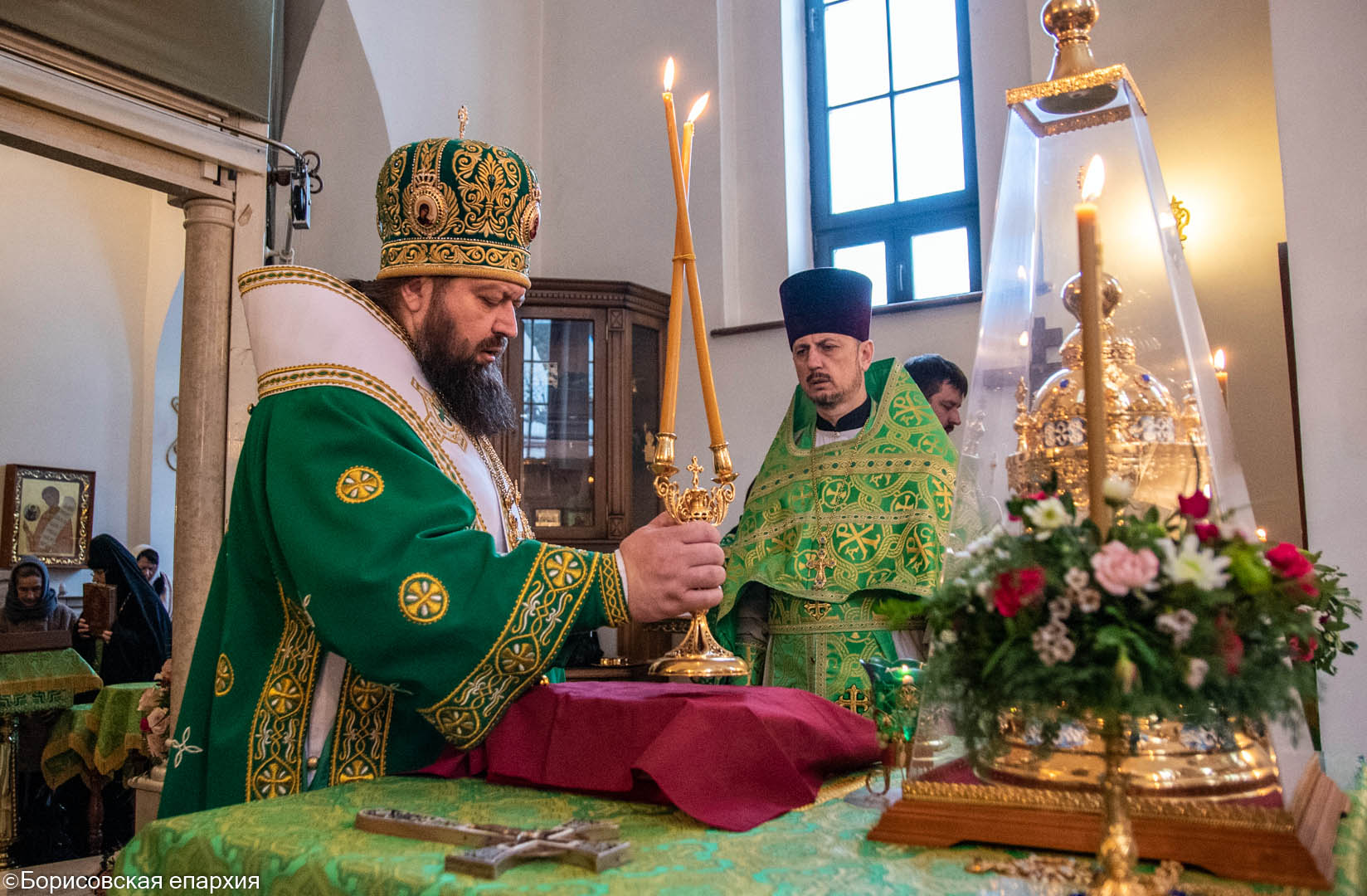 Его Преосвященству сослужили: старший духовник Борисовский епархии, благочинный Крупского церковного округа, настоятель храма святителя Николая Чудотворца г. Крупки протоиерей Николай Гмир; секретарь Борисовской епархии, благочинный 1-го Борисовского церковного округа, настоятель храма Рождества Христова г. Борисова протоиерей Александр Вербило; ключарь кафедрального собора Воскресения Христова г. Борисова протоиерей Павел Яцукович, а также клирик собора иерей Артемий Прокофьев и клирик монастыря иерей Александр Агеенко.