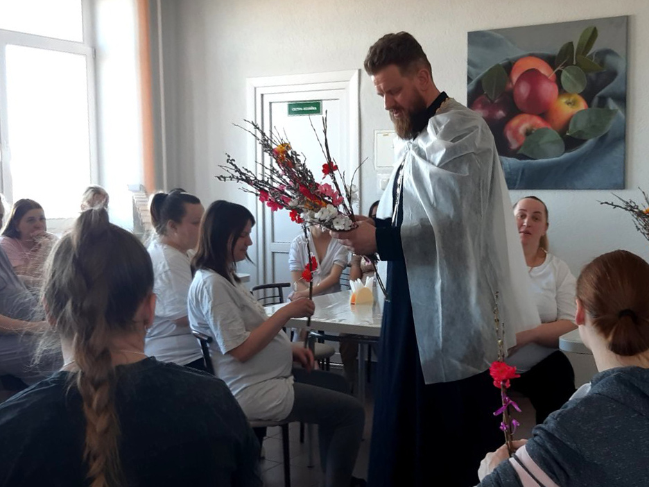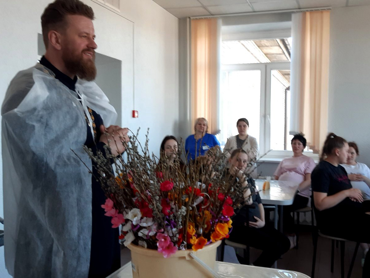При организационной поддержке психолога роддома Русановой Екатерины Дмитриевны священник провёл три круглых стола с беременными и пациентками гинекологических отделений. «Верба, как и кулич, и вода не является «героем» праздника. Во всех случаях, речь о Христе. Вербное воскресенье – это историческое событие входа Христа в город Иерусалим. Начало Его страстного пути к Кресту. Войдя как царь, он станет угнетённым и избитым. Но пока, мы вспоминаем детей кричащих «Достоин!!!» Господу, кидающих под ноги пальмовые ветви. В нашей традиции мы одариваем себя и родных вербочками – напоминая себе и всем о полноте жизни, о начале возрождения и зарождения. Для Вас – беременных важно напомнить о жизни и её начале, Вам надо понимать своё предназначение и ту роль в создании новой жизни. Конечно в эти дни мы хотим вам подарить хорошее настроение и улыбки, которые являются важными в успешном родоразрешении». В конце встреч священник одарил всех вербой, красиво украшенной прихожанами храма иконы Божией Матери «Всех скорбящих радость» д.Гора. Духовник роддома прошёл с подарками и словами радости ко всем медработникам и администрации учреждения.