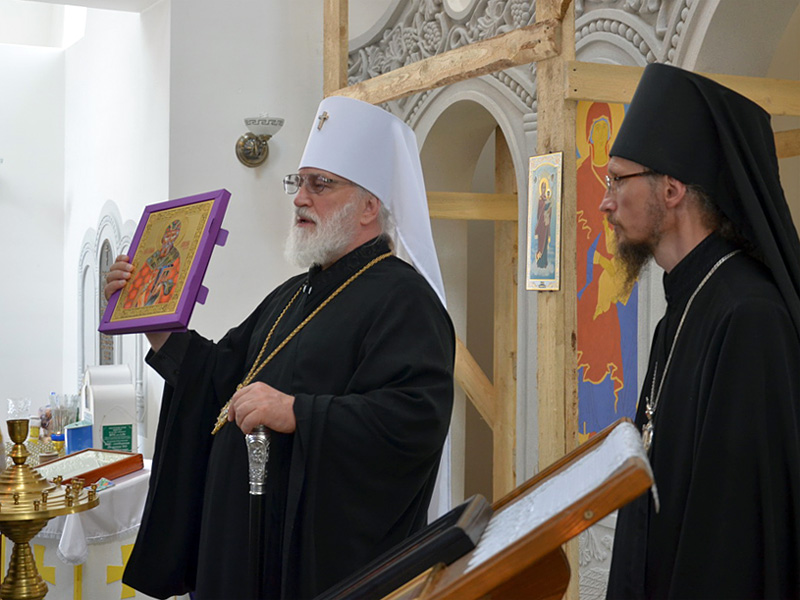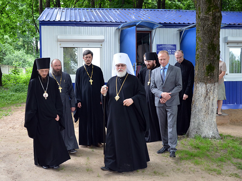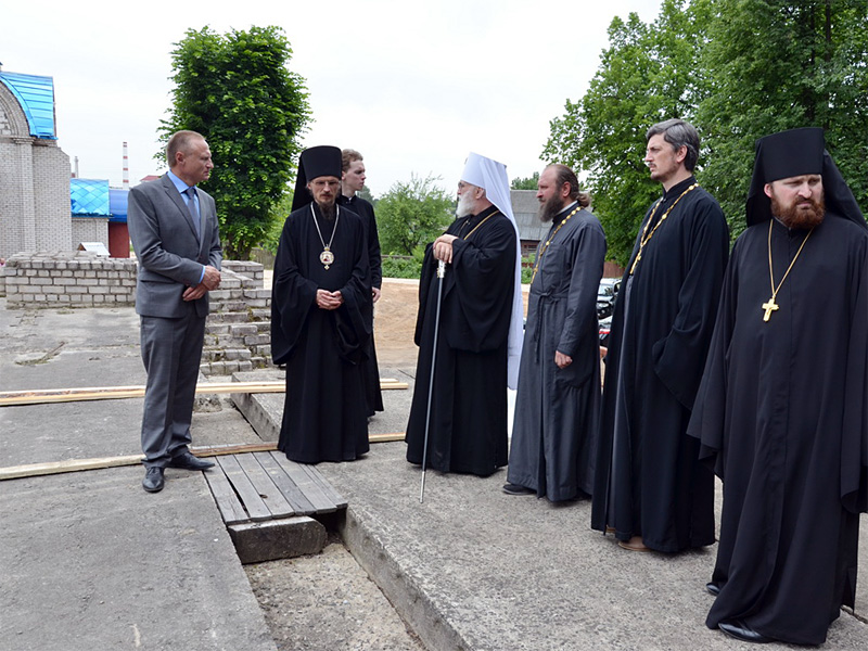 Затем Предстоятель Белорусской Православной Церкви посетил храм-часовню Святого Богоявления и строящийся храм Святой Живоначальной Троицы. Поднявшись на цоколе храма, настоятель прихода протоиерей Георгий Тюхлов поведал Владыке и всем его сопровождающим об истории создания этого храма-памятника, заложенного в честь воинов, жизнь свою за Отечество положивших, а также о перспективах его дальнейшего строительства.