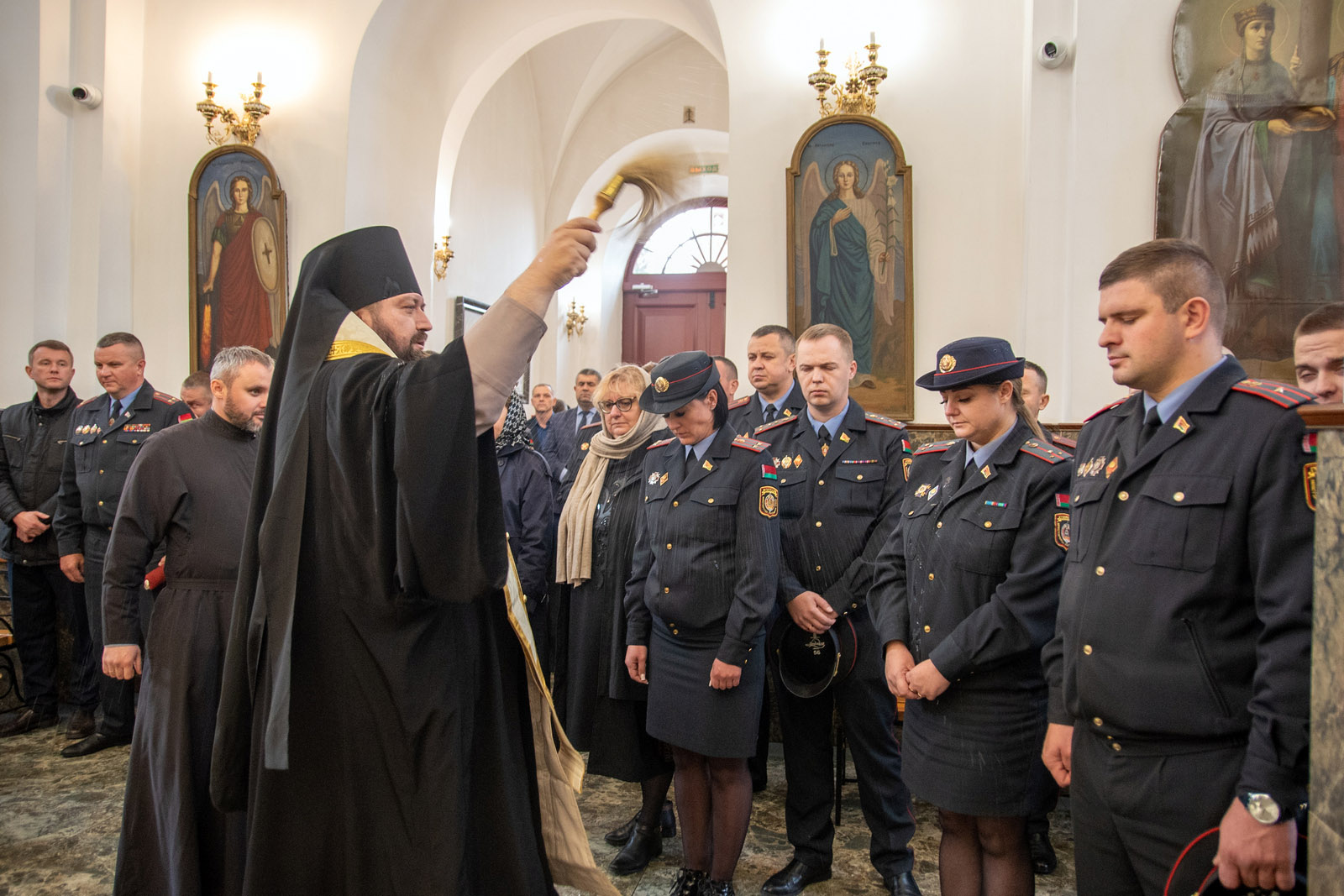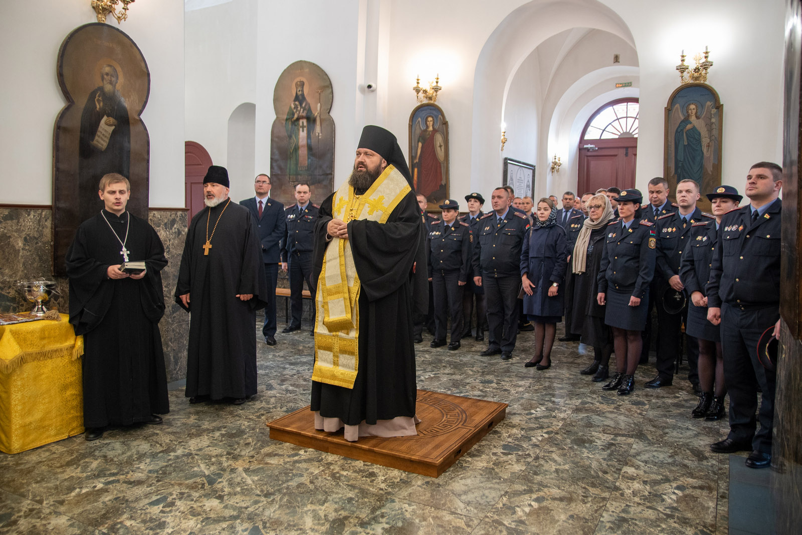 Затем, как принято при начале важного дела, архиерей совершил молебен — в благодарение Господу за дарование сил и мудрости на ответственную службу по защите правопорядка и безопасности граждан. По окончании молебна епископ Амвросий окропил личный состав святой водой и в знак архипастырского благословения вручил каждому сотруднику иконочку Святой Троицы и небольшой молитвослов.