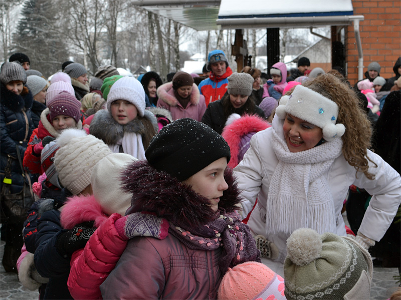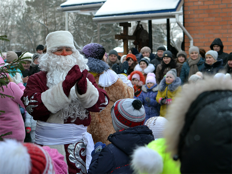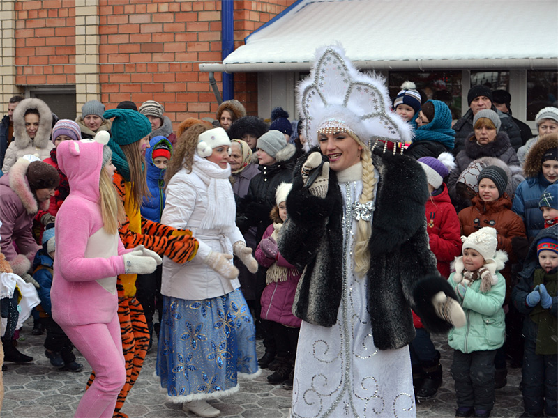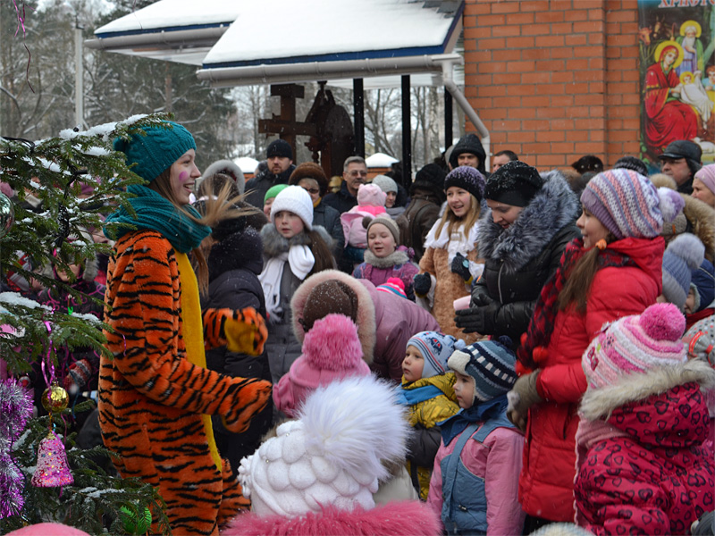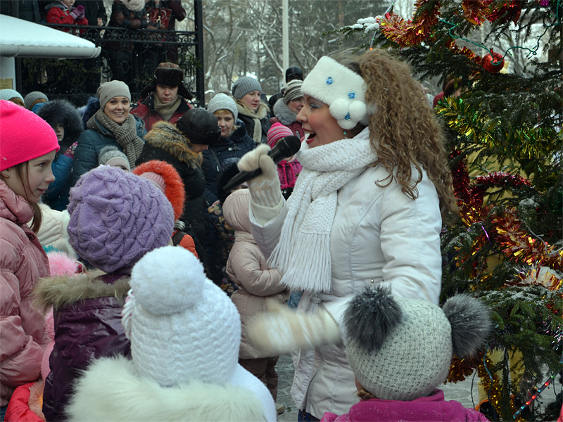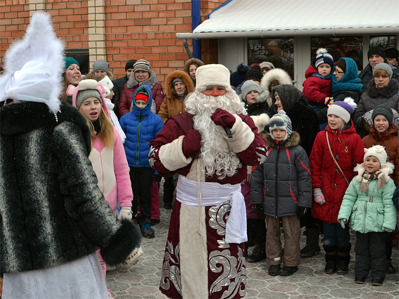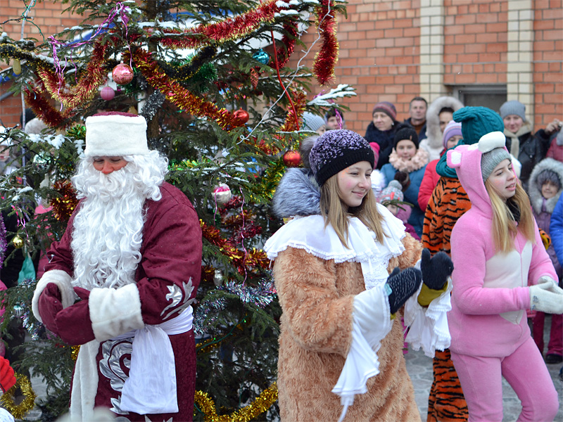 Вокруг ёлки собралось множество детей дошкольного и младшего школьного возраста и их родители. В гости к детям пришли Дед Мороз и Снегурочка, сказочные персонажи. Они водили хороводы, пели песни, загадывали загадки.