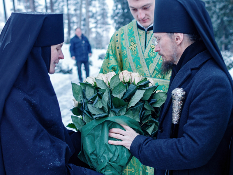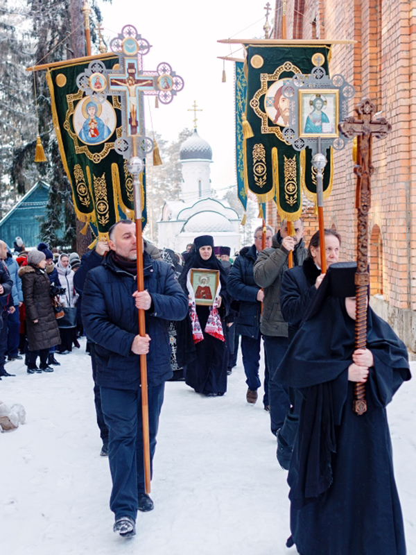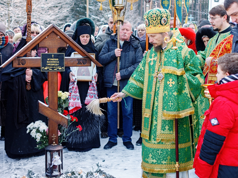 По окончании литургии был совершён крестный ход, во время которого, у места захоронения убиенной игуменьи Василиссы (Медведь), была совершена заупокойная лития. Затем владыка Вениамин поздравил всех с престольным праздником небесной покровительницы обители, святой блаженной Ксении Петербургской, и обратился к молящимся с проповедью.