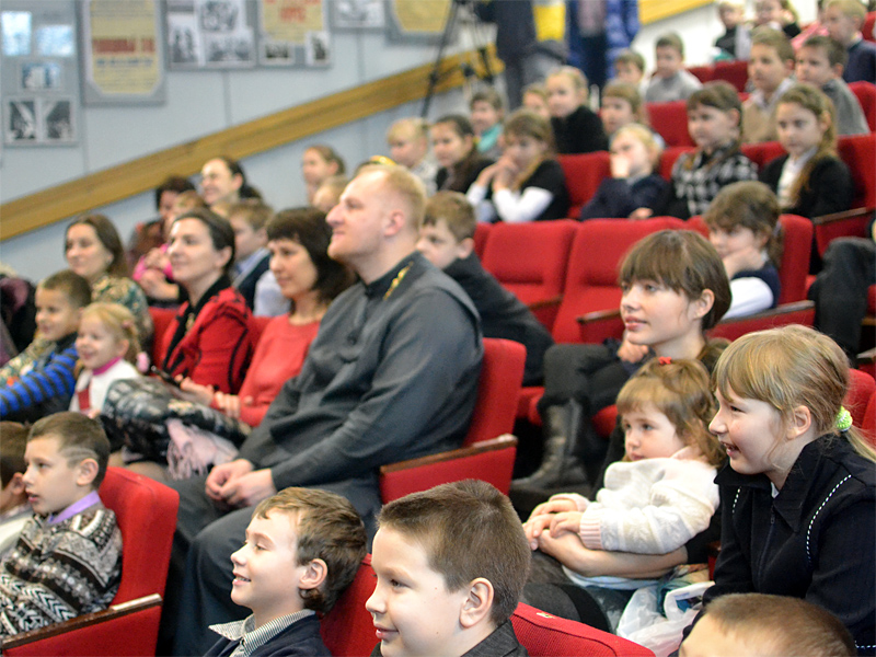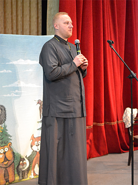 Сейчас он был приглашен Борисовским благочинием, чтобы в рождественские дни вновь встретиться с маленькими зрителями. Эта встреча состоялась в малом зале городского Дворца культуры. Приветствуя актера и участников спектакля, настоятель прихода храма святого благоверного князя Дмитрия Донского священник Сергий Башкиров поздравил всех с праздником Рождества Христова. Он отметил, что Александр Жданович глубоко верующий человек и в своем спектакле не только увлекает детей интересными играми, но и ведет разговор о Христе.