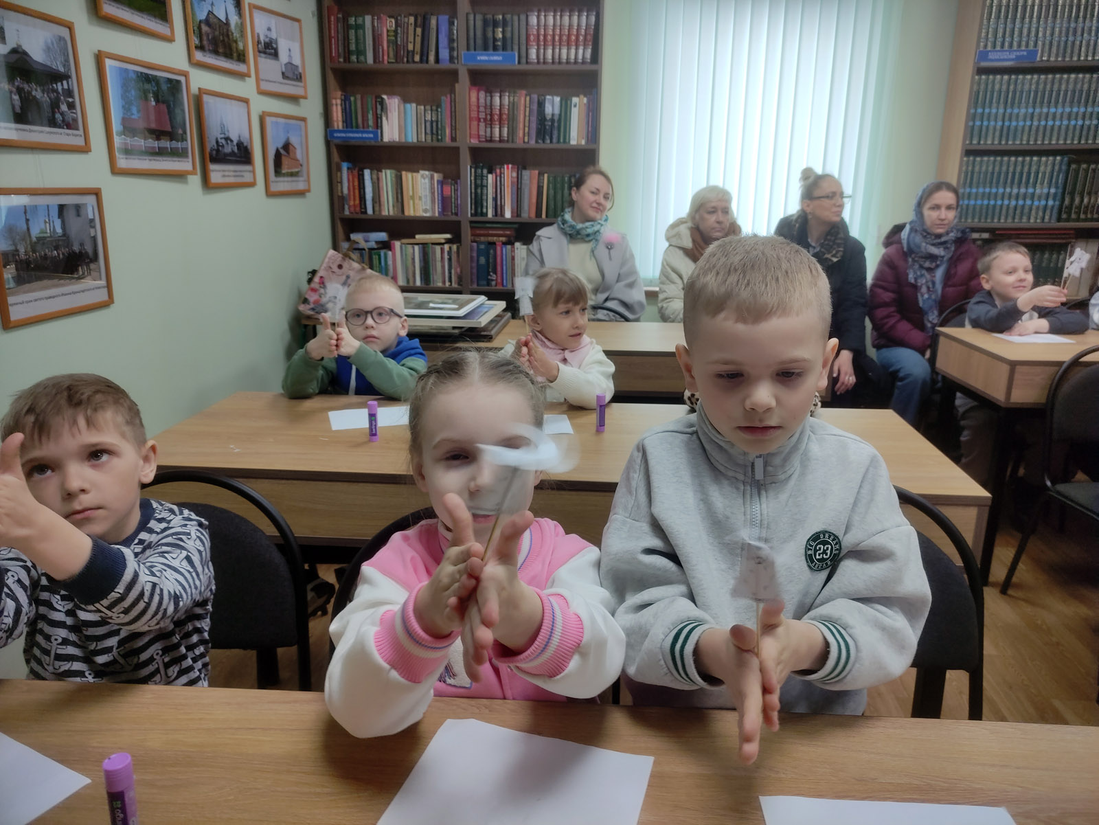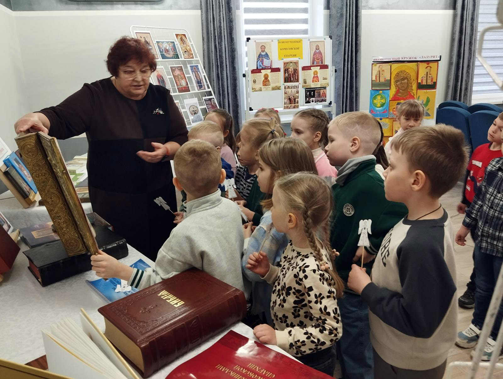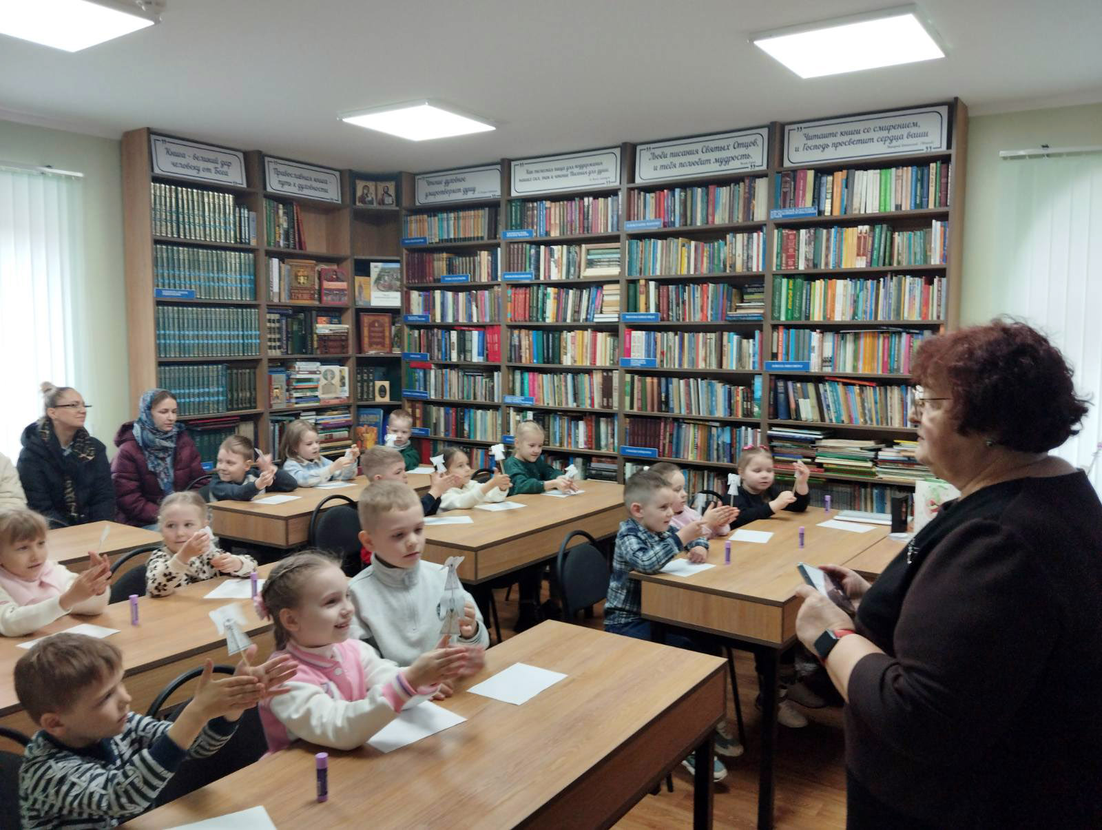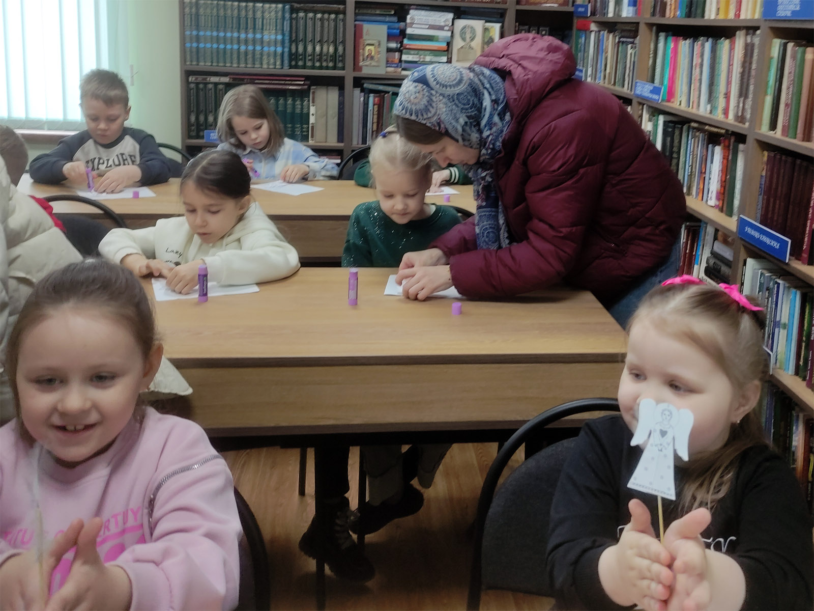 В духовно-просветительском центре ребята познакомились со старинными книгами, рассмотрели иллюстрации в детских православных изданиях. Особый интерес вызвали предметы, предназначенные для новорожденных. В православной библиотеке дети посмотрели фильм о вере - о птичке и девочке, которым помог добрый ангел. Затем ребята своими руками изготовили бумажных «ангелочков».
