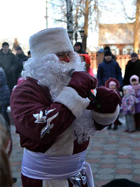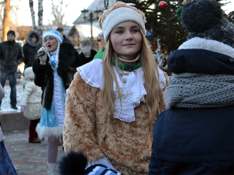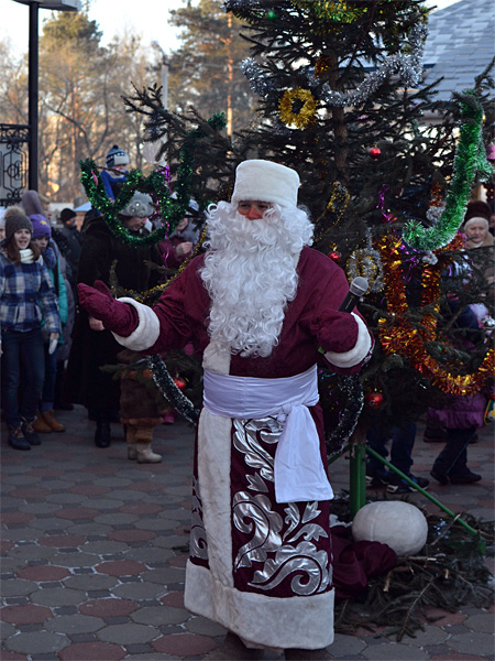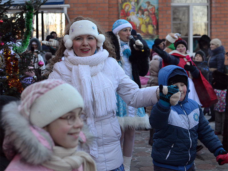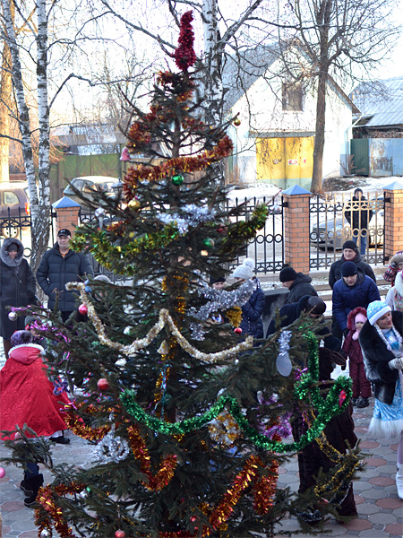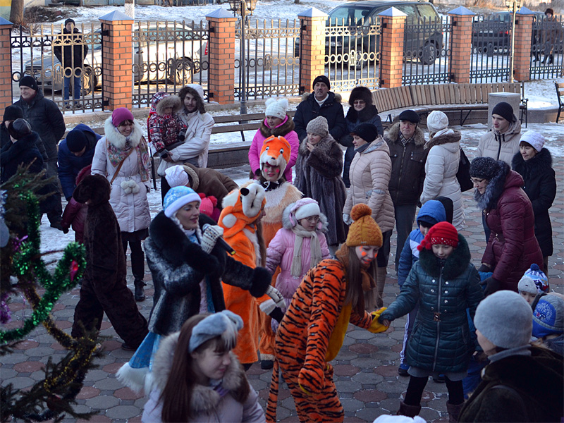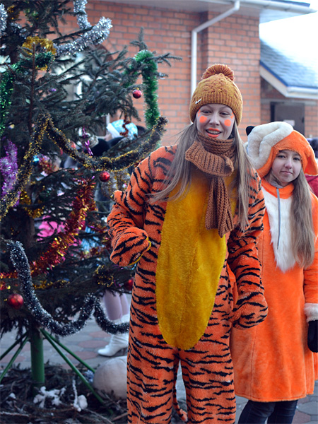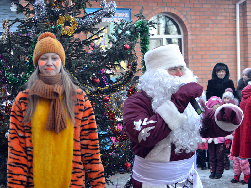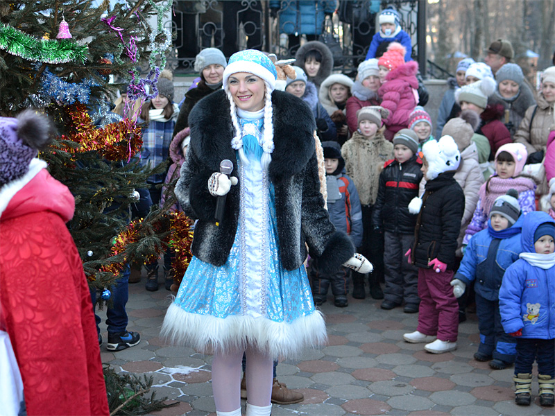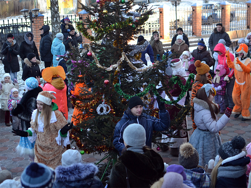 Вокруг ёлки собралось множество детей дошкольного и младшего школьного возраста и их родители. В гости к детям пришли Дед Мороз и Снегурочка, сказочные персонажи. Они водили хороводы, пели песни, загадывали загадки.