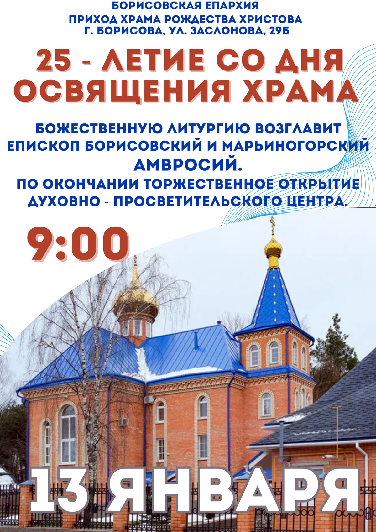 13 января в честь 25-летия освящения храма Рождества Христова г. Борисова епископ Борисовский и Марьиногорский Амвросий совершит Божественную литургию.