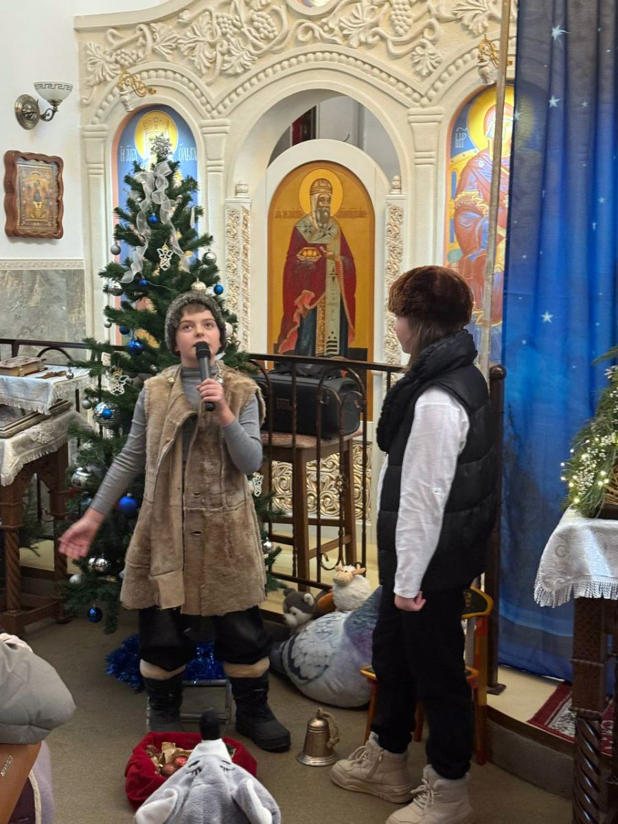 Под руководством матушки Натальи Шабловской и Натальи Владимировны Акуленко юные артисты представили зрителям яркое костюмированное представление, наполненное песнями, стихами и добрыми сценками о светлом празднике Рождества Христова.