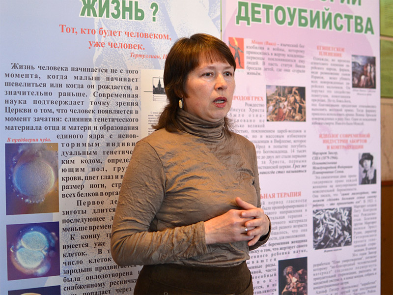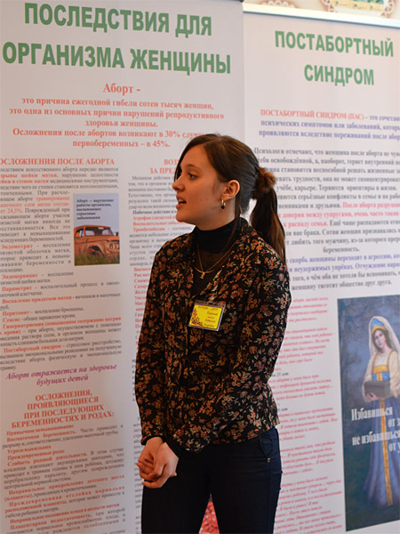 «Наше участие в этой выставке очень необходимо и важно, — сказала заведующая отделением повышения квалификации, преподаватель акушерства и гинекологии Светлана Фоминична Мозгунова. — Одной из важнейших задач медицинских работников является профилактическая деятельность в сохранении здоровья девушек и женщин, а также и мужчин, так проблема абортов касается и их тоже. Аборт — это операция, и она не бывает безопасной. До 30% женщин после аборта становятся бесплодными, приобретают различные заболевания, в том числе психические травмы. Мы открыто говорим, что свою жизнь можно построить по-другому, отказавшись от аборта».