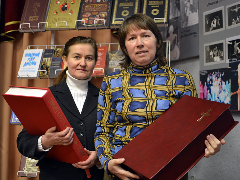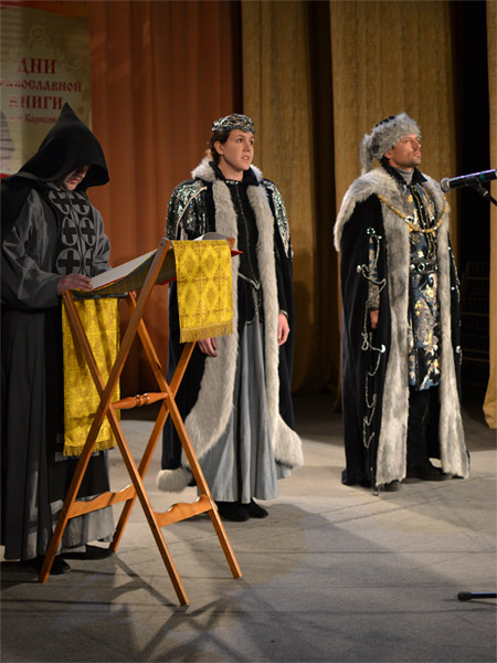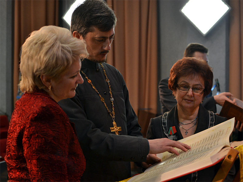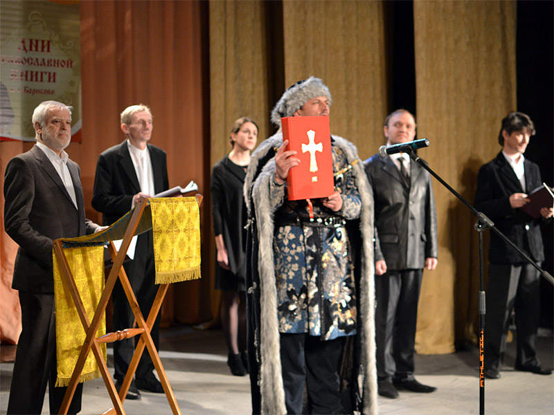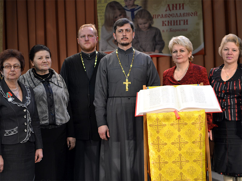 После этого состоялась торжественная церемония передачи г. Борисову факсимильного издания Слуцкого Евангелия. На сцену приглашаются исполнительный директор Международного благотворительного фонда и координатор программы «Семья. Единение. Отечество» Константин Владимирович Яскевич, благочинный Борисовского церковного округа, настоятель прихода храма Рождества Христова протоиерей Александр Вербило и заместитель председателя Борисовского районного исполнительного комитета Л.А. Даргель. От имени издательства Белорусского Экзархата К.В. Яскевич передает Слуцкое Евангелие отцу Александру, а он затем Л.А. Даргель, которая поблагодарила издательство и благочинного за столь ценный подарок и объявила всем, что оно с этих пор будет храниться в Борисовской центральной районной библиотеке им. И. Х. Колодеева.