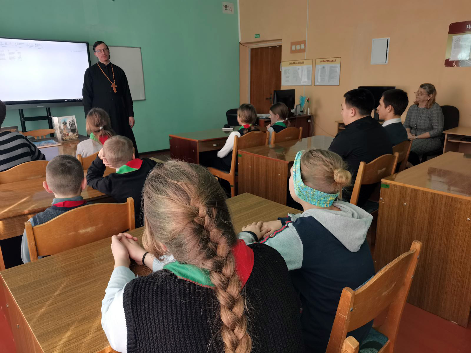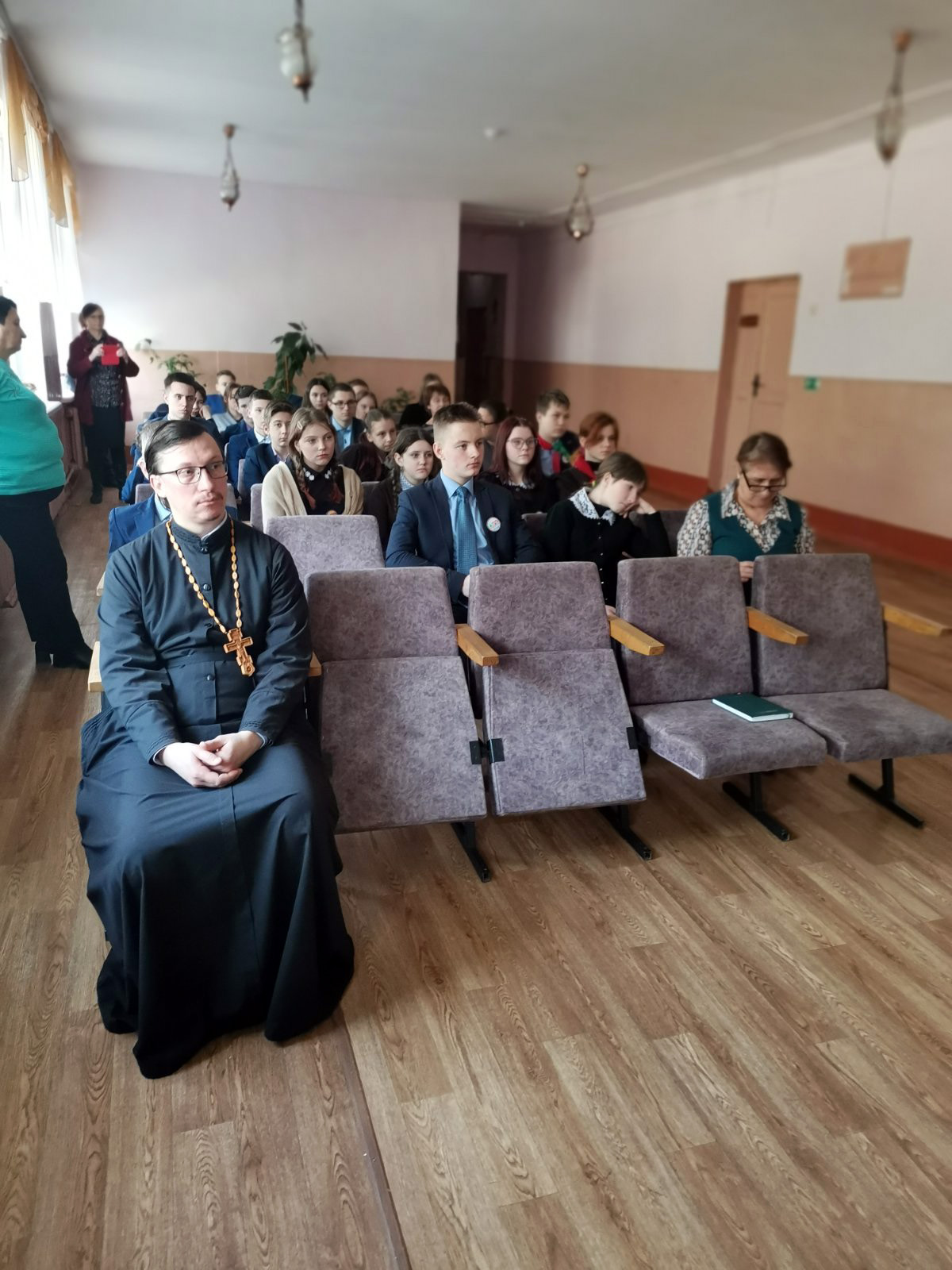 Перед учащимися выступил клирик женского монастыря в честь святой блаженной Ксении Петербургской иерей Александр Агеенко. Он говорил о Библии, главной книге христиан, о значении православной книги для духовного просвещения не только верующих, но и мирян.
