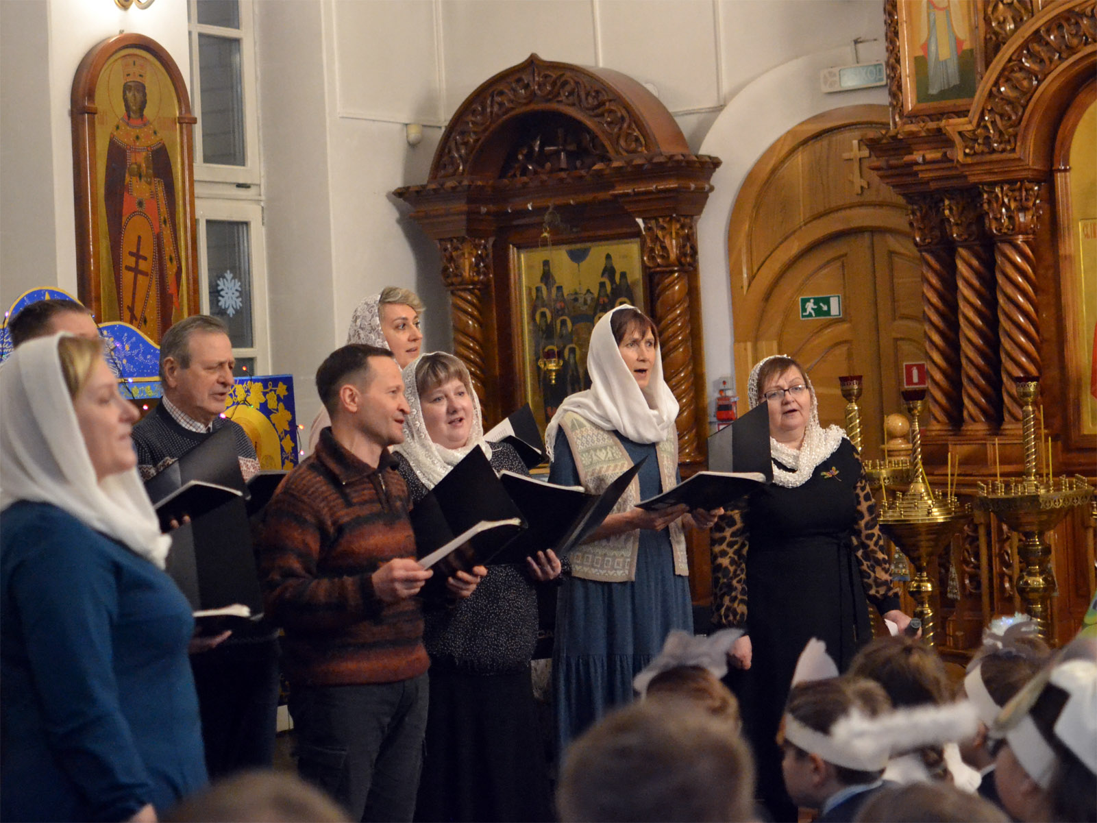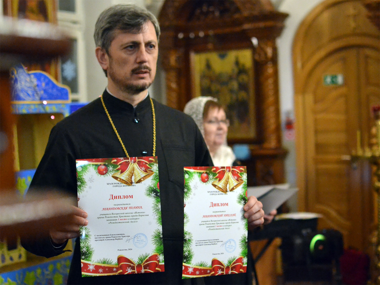 На концерте с рождественскими песнями и стихами выступили учащиеся приходской детской воскресной школы, а также приходской церковный хор храма Рождества Христова под управлением регента Елены Вербило. С праздником организаторов и участников концерта, детей и их родителей поздравил секретарь Борисовской епархии, благочинный 1-го Борисовского церковного округа, настоятель прихода храма Рождества Христова протоиерей Александр Вербило.