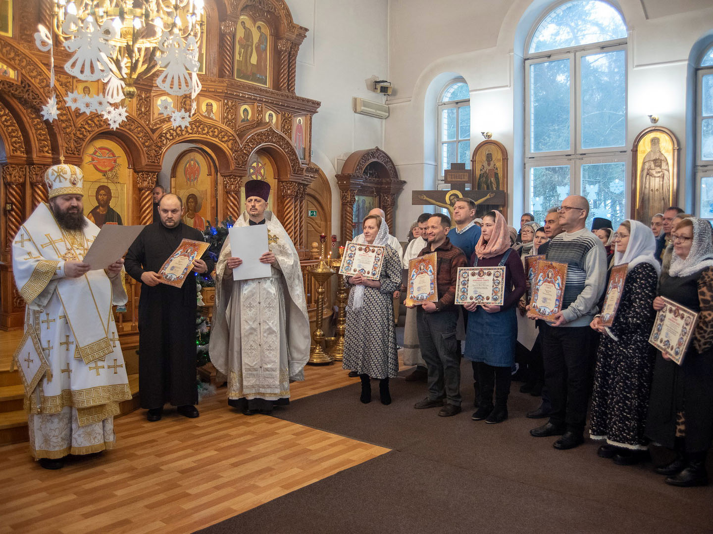 Далее секретарь Борисовского епархиального управления протоиерей Александр Вербило от лица духовенства Борисовской епархии и мирян поздравил владыку со светлым праздником Рождества, а секретарь Борисовской епархии протоиерей Сергий Башкиров преподнёс букет белых цветов. Далее владыка наградил медалью Марьиногорской иконы Божией Матери II степени Уточкина Сергея Валерьевича, удостоил архиерейских грамот особо потрудившихся на благо развития прихода.