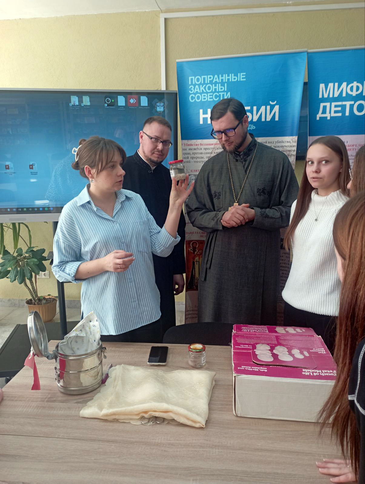 Беседа состоялась при участии клирика кафедрального собора Воскресения Христова г. Борисова иерея Артемия Прокофьева. Быть нравственными и духовно чистыми, знать, всегда помнить и соблюдать заповеди Иисуса Христа в будущем браке и в семейных ценностей отношениях, любить своих детей, как этому учит Господь – таков лейтмотив его выступления.