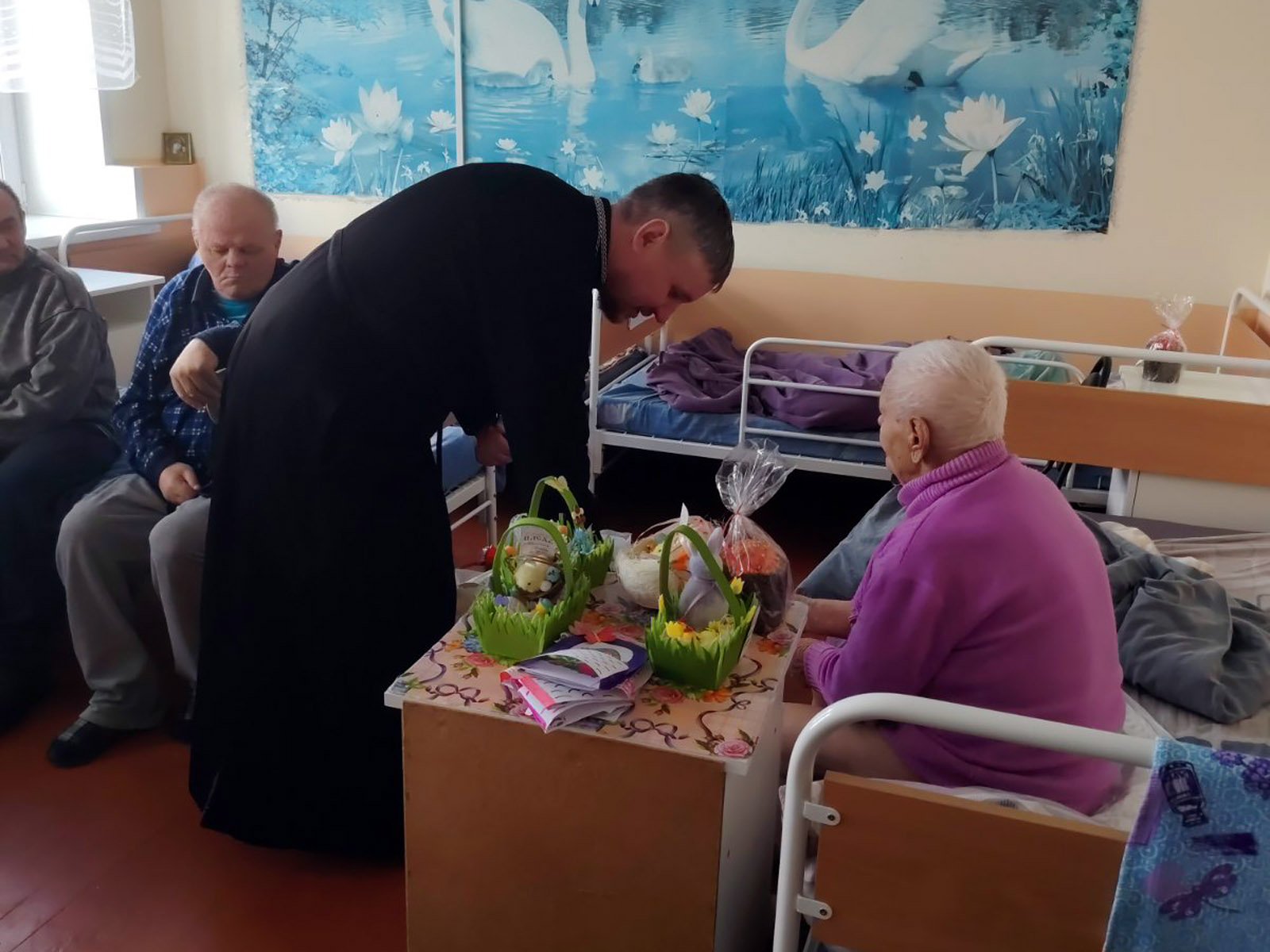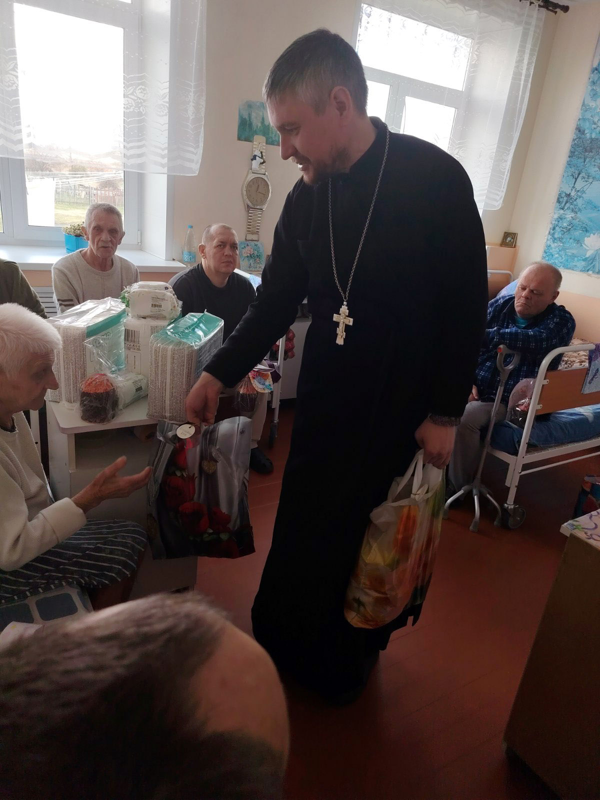 Также священник вручил каждому проживающему крашеные яйца, символ жизни и возрождения, передал куличи, освящённые на пасхальной службе и именные подарки собранные прихожанами Кафедрального собора Воскресения Христова г. Борисова. Подарки включали в себя как предметы первой необходимости, так и приятные мелочи, способные поднять настроение. Каждый предмет был выбран с мыслью о том, кому он предназначен, чтобы принести максимум пользы и искреннюю радость. Эти скромные, но такие значимые знаки внимания принесли ещё больше света и тепла в стены больницы.