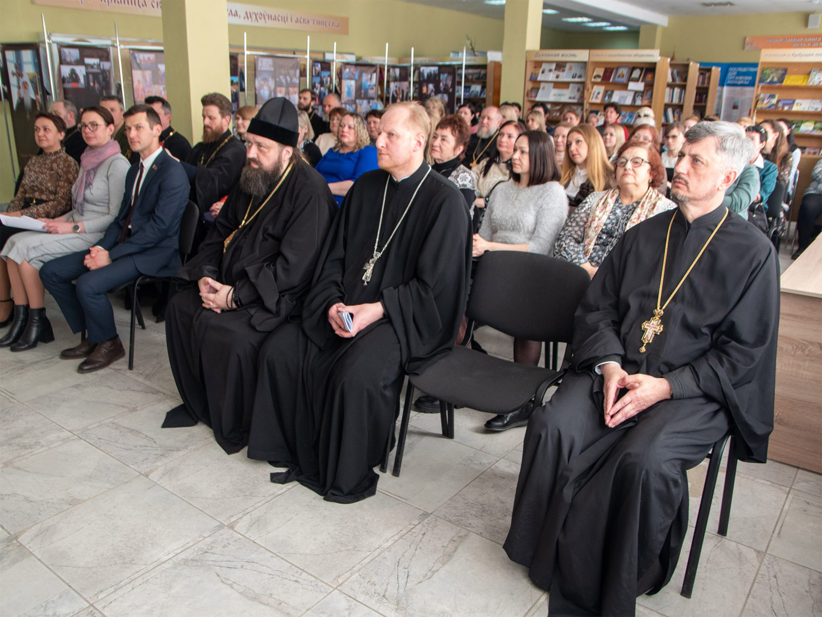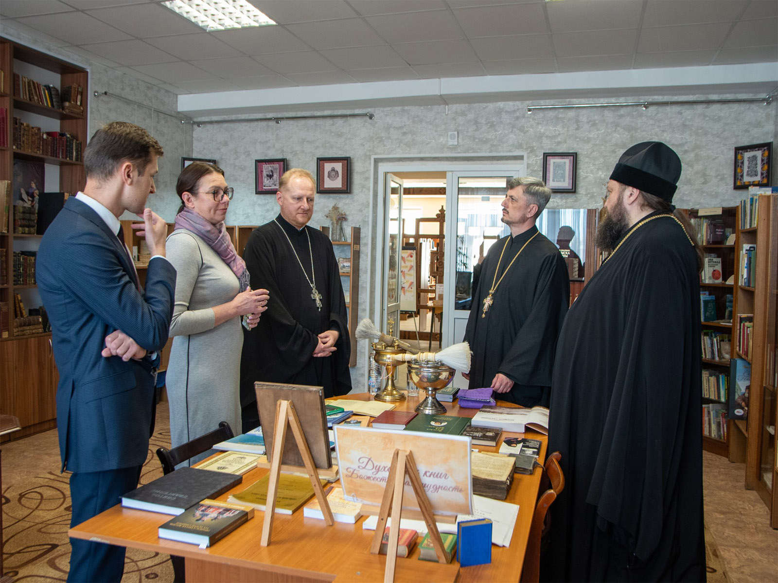 В ходе встречи епископ Амвросий представил собравшимся энциклопедический справочник «Новомученики и исповедники земли Белорусской», а также рассказал о современных направлениях православного книгоиздания и новых изданиях духовной литературы. В дар библиотеке была передана подборка православных книг.