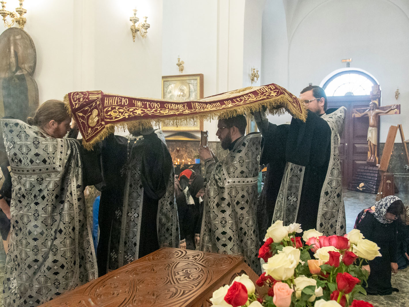 В конце вечерни, при пении тропаря «Благообразный Иосиф, с древа снем Пречистое Тело Твое», из алтаря на середину храма была вынесена Святая Плащаница с изображением погребения Христа.