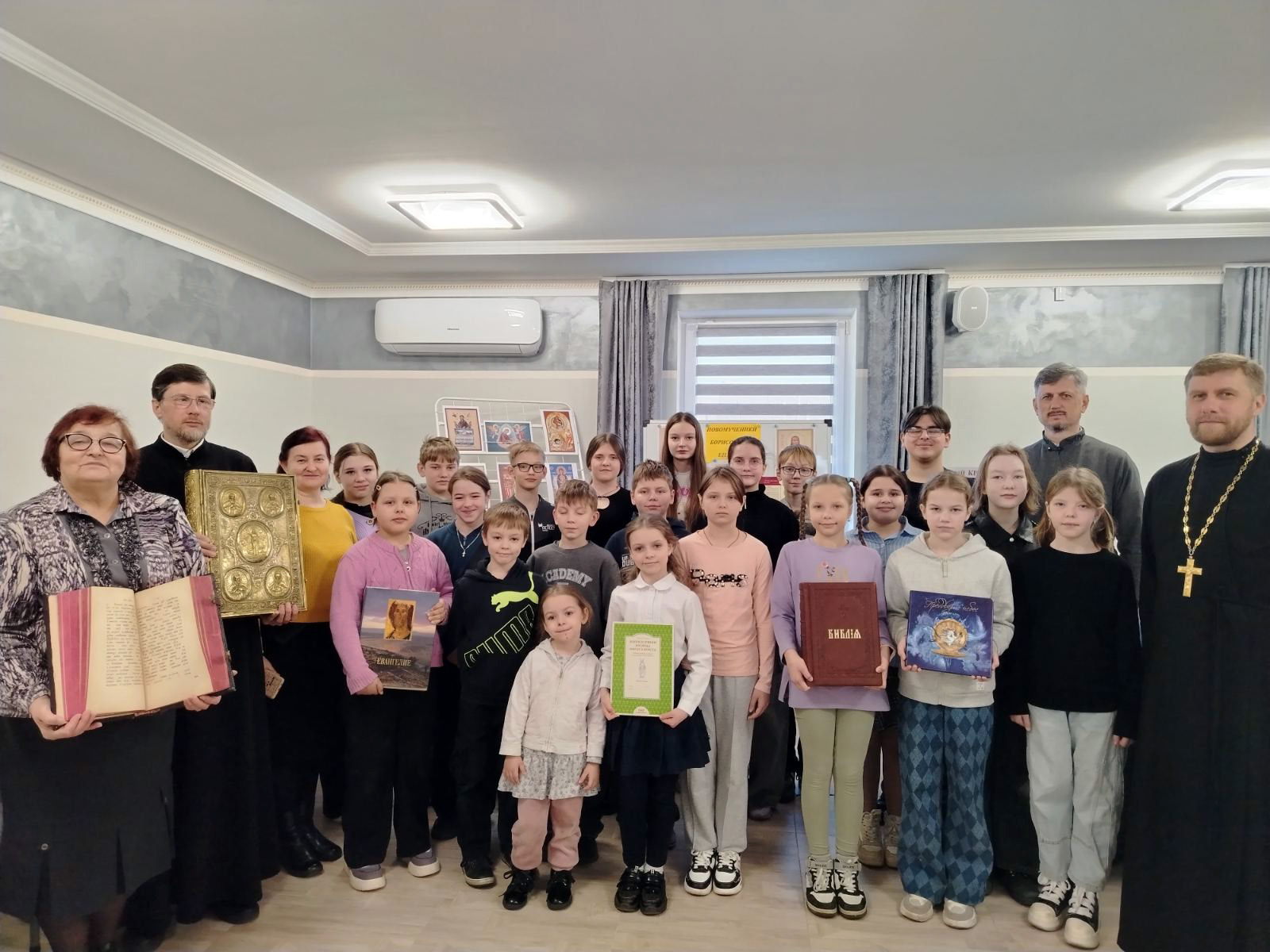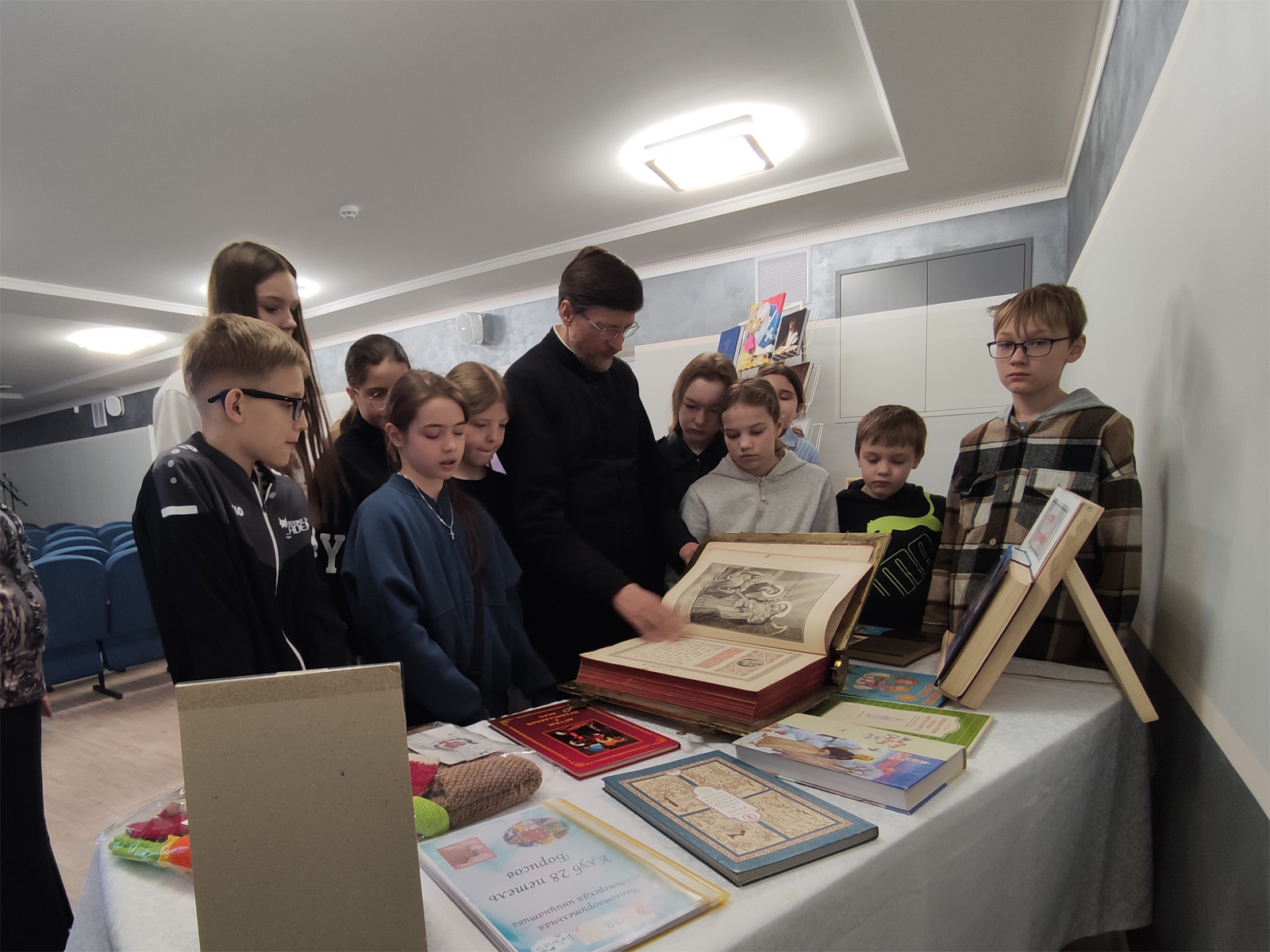В ходе беседы ребята имели уникальную возможность прикоснуться к истории, рассматривая старинные издания Библии, Евангелия, Псалтири и молитвослова. Их глаза горели интересом, когда они узнавали о том, как эти священные тексты передавались из поколения в поколение, сохраняя свою первозданную чистоту и значимость. Особое внимание было уделено и православной детской литературе, которая, по словам отца Михаила, является первым шагом к пониманию сложных истин веры, изложенных в доступной и увлекательной форме. Ребята с удовольствием листали яркие страницы, рассматривали иллюстрации и задавали вопросы, демонстрируя живой интерес к прочитанному.
