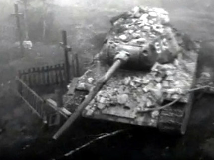 Кстати, о самом фильме. Благодаря Интернету «Перекличку» сейчас может увидеть любой желающий. На черно-белой ленте прекрасно виден тот самый момент, когда грозный Т-34 проламывает стену храма, а потом выезжает с погнутым дулом из-под груды церковного кирпича. Далее кадры еще более жуткие: танк едет по крестам и могилам. Дело в том, что сразу за храмом действительно был именно такой пейзаж. Сейчас крестов нет, но мы фактически ходим по кладбищу. Ольга Князева не помнит, когда конкретно исчезли могилы — после съемок или еще до них. По бутафорским ли крестам ехал танк или все-таки по настоящим — сейчас сказать сложно.