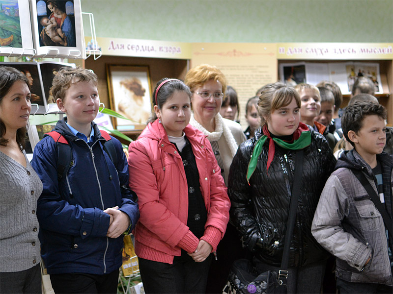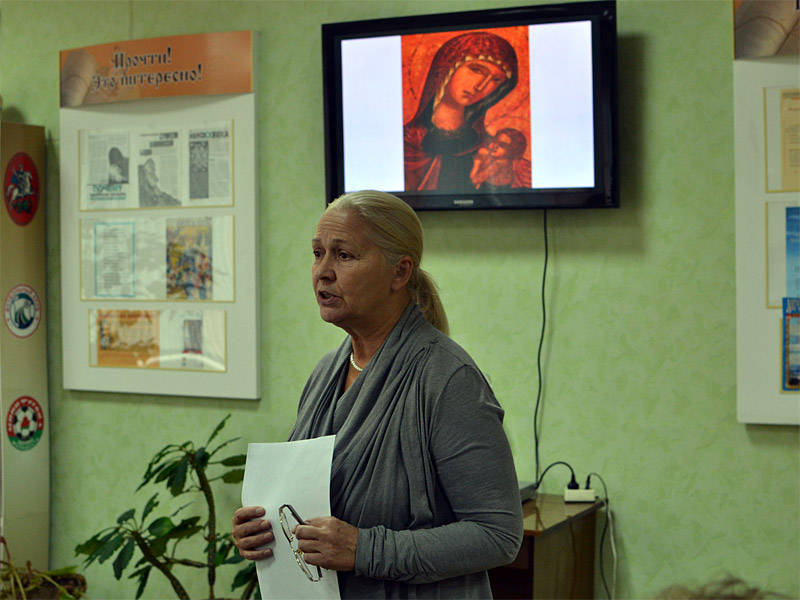 О самой выставке, ее экспонатах, стендах рассказала волонтер группы поддержки грудного вскармливания Станкевич Татьяна Дмитриевна. С большим интересом было воспринято выступление иконописца, художницы Стасевич Галины Харитоновны, которая говорила об иконах Пресвятой Богородицы, и в частности, об одной из них — иконе Божией Матери «Млекопитательница». Психолог родильного дома Русанова Екатерина Дмитриевна затронула тему взаимоотношения супругов, о том, что с юных лет девушка должна вести такой образ жизни, чтобы при рождении ребенка не испытывала проблем при кормлении ребенка. Настоятель прихода храма святого благоверного князя Дмитрия Донского иерей Сергий Башкиров поздравил всех присутствующих с праздником Покрова Пресвятой Богородицы, пожелал, чтобы на всю жизнь они сохранили любовь к матери, женщине, призвал их при этом чаще обращаться к Священному Писанию, к Церкви.