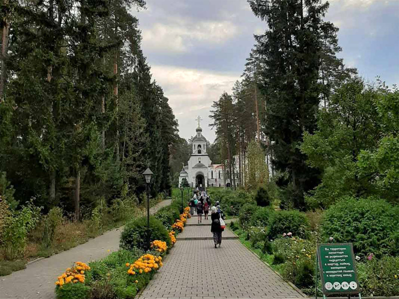 Одна из насельниц провела экскурсию по монастырю. Гости познакомились с устройством главного храма, возведенного и названного в честь Святой Блаженной Ксении Петербургской. Он имеет два придела: верхний — в честь небесной покровительницы обители, и нижний — в честь преподобного Серафима Саровского. Стоящий на холме, на фоне леса храм выглядит, словно белоснежный корабль.