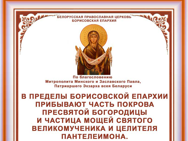 По благословению епископа Борисовского и Марьиногорского Вениамина в пределы Борисовской епархии Белорусской Православной Церкви доставят часть Покрова Пресвятой Богородицы и частицу мощей святого великомученика и целителя Пантелеимона. Святыни будут пребывать в Борисовской епархии с 15 ноября по 23 декабря 2018 года.