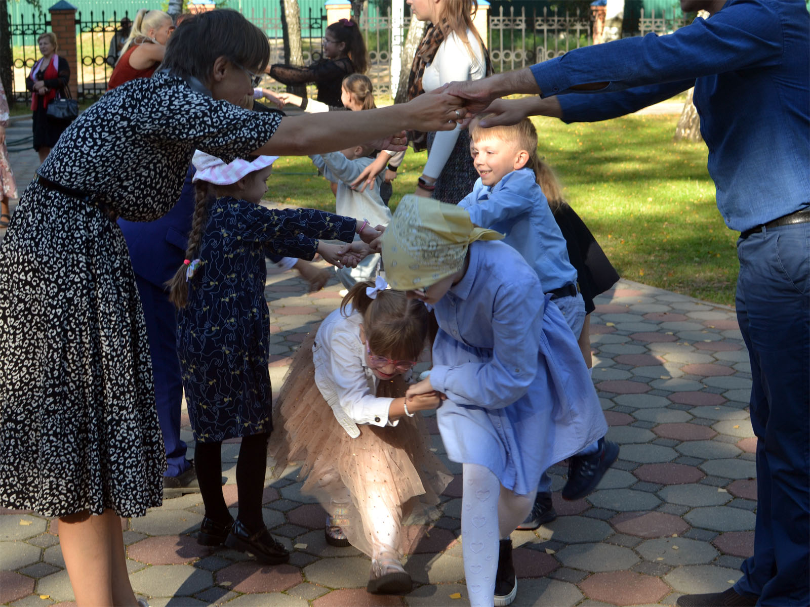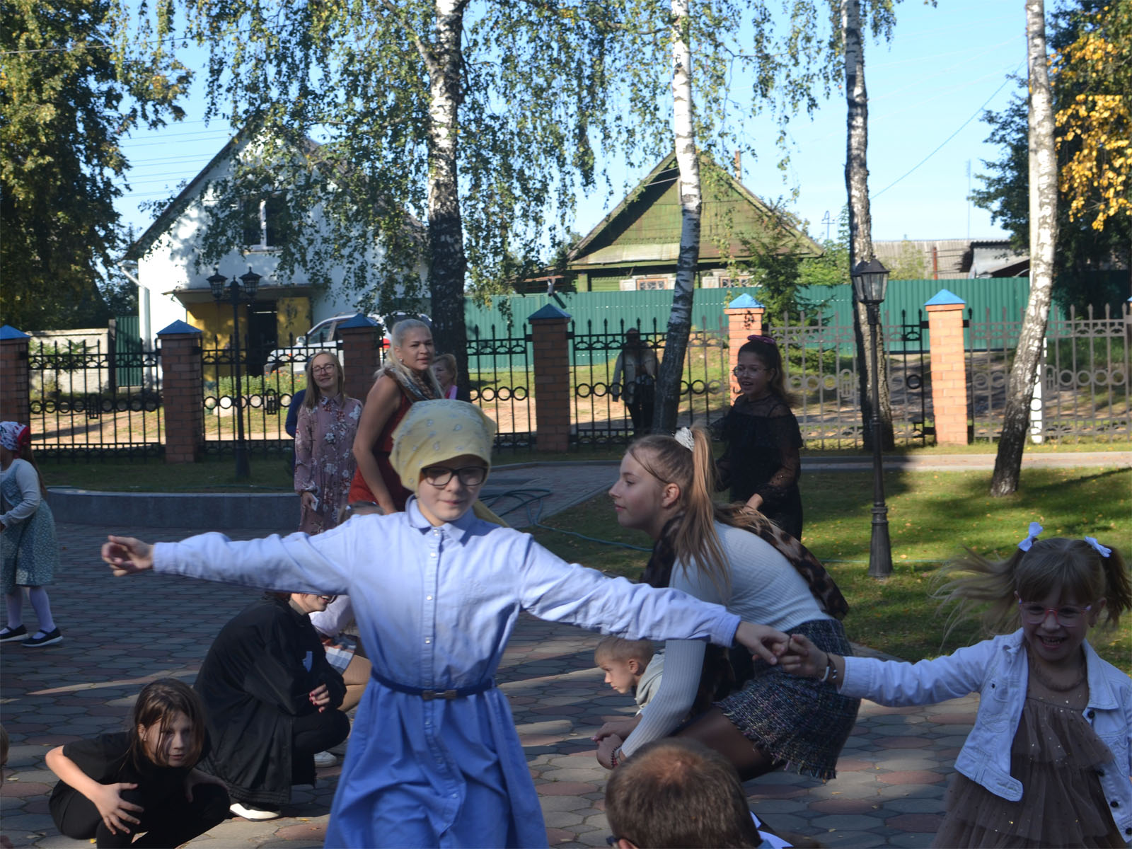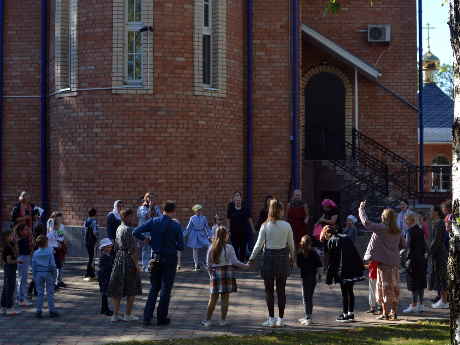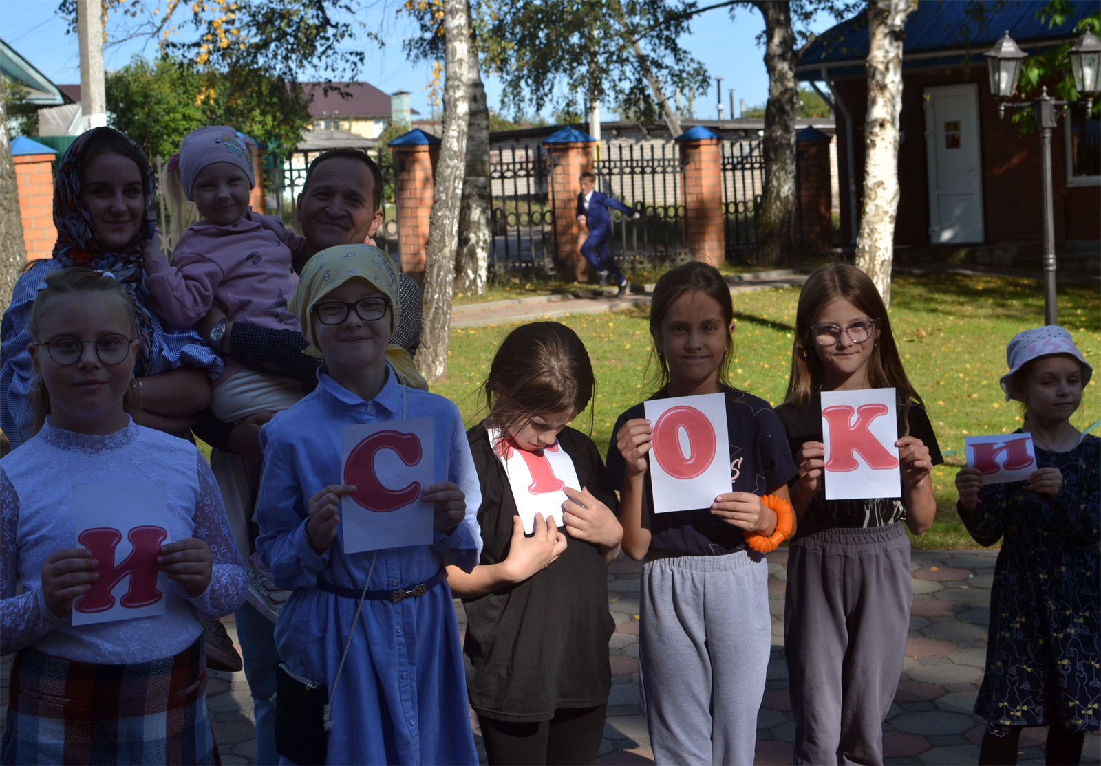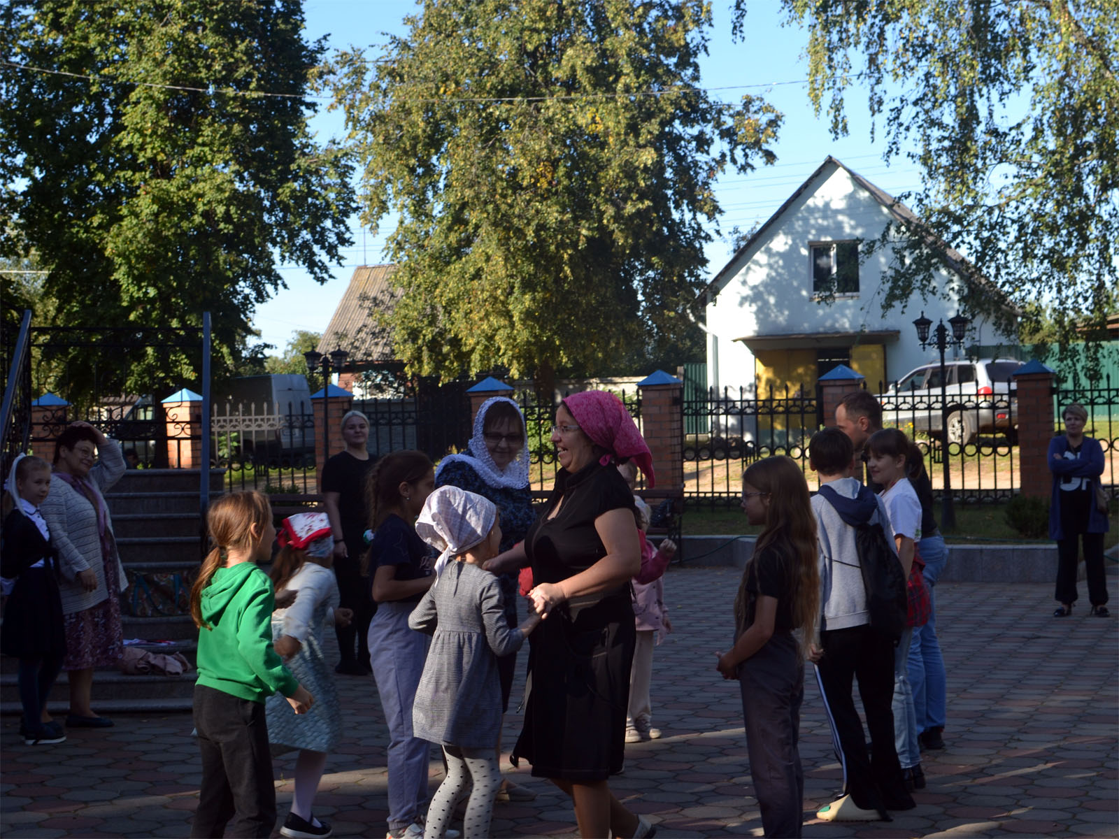 После этого дети разделились на несколько команд и была проведена познавательная игра с использованием букв. В результате было составлено слово «Мы истоки». Именно так, «Истоки», носит название воскресной школы. Затем ребята вместе с родителями на площадке храма водили хороводы, танцевали.