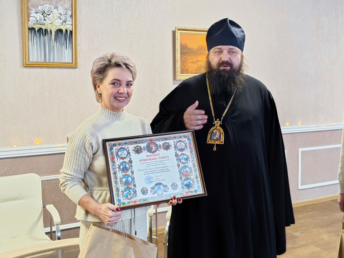 Епископ Амвросий встретился с директором центра Копыток Ольгой Витольдовной, обсудил с ней вопросы работы и дальнейшего взаимодействия ТЦСОН и Борисовской епархии и удостоил ее архиерейской грамоты.