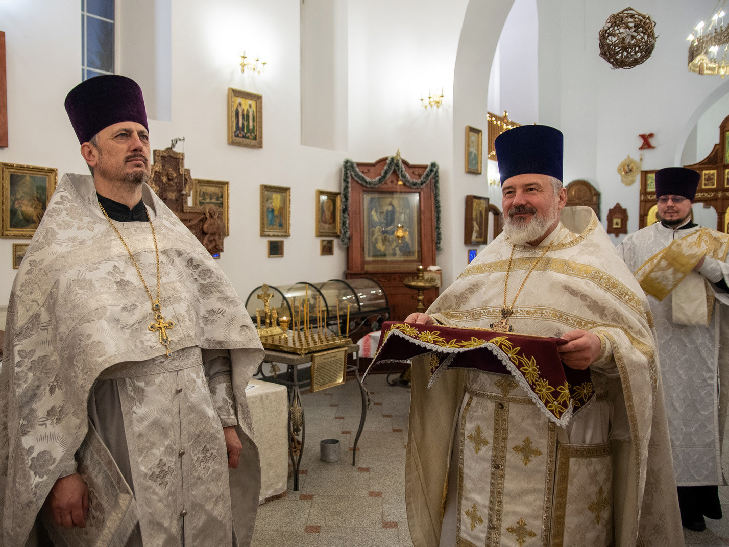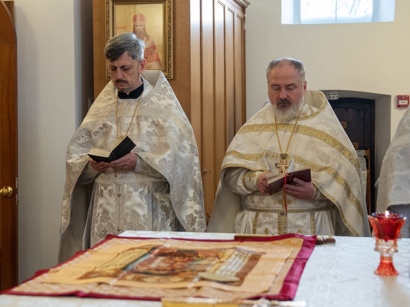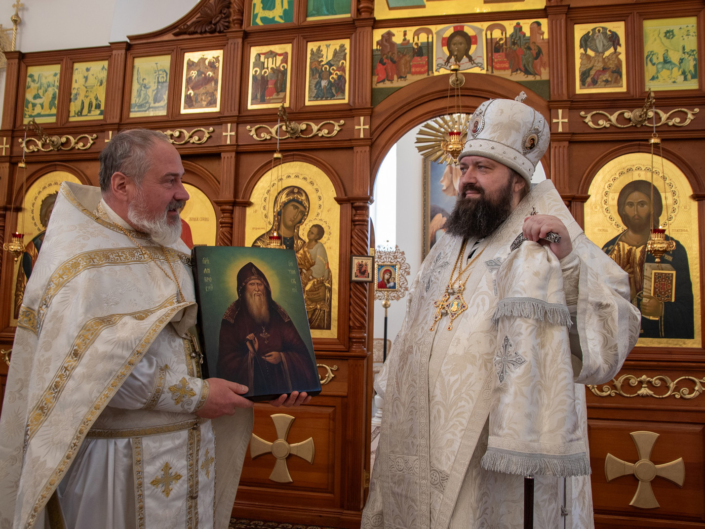 По завершении Литургии владыка Амвросий сердечно поздравил протоиерея Андрея Капульцевича с 55-летием со дня рождения, пожелав ему помощи Божией в несении пастырского служения, крепости духовной и доброго здравия и подарил ему на память икону преподобного Амвросия Оптинского.