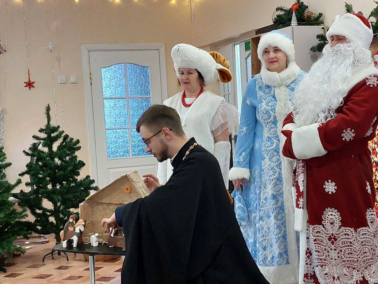 Иерей Вадим Свириденко рассказал о рождении Христа. Чтобы было понятно малышам, батюшка использовал вертеп с деревянными фигурками.