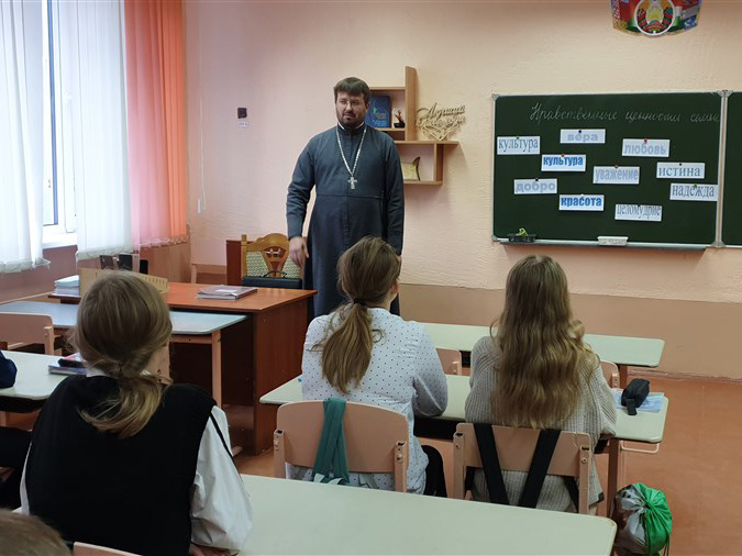 На занятии священнослужители в интересной и доступной форме беседовали с ребятами о самых серьезных и важных для каждого человека понятиях, таких как смысл жизни, любовь, вера.
