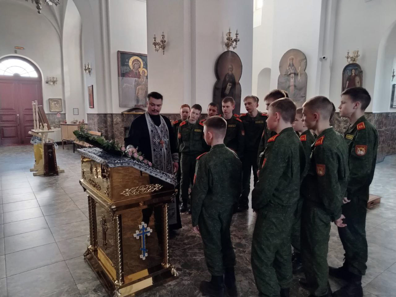 Беседа прошла в кафедральном соборе Воскресения Христова. Священник рассказал ребятам об устройстве храма и провел для них экскурсию. Особое внимание в беседе было уделено знакомству с Евангелием — главной книгой христиан. Иерей Сергий объяснил кадетам духовные основы православного воинства, важность веры и нравственного выбора в служении Отечеству.