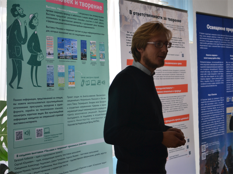 Благочинный 1-го церковного округа, настоятель прихода храма Рождества Христова г. Борисова протоиерей Александр Вербило, приветствуя участников семинара, остановился на богословском осмыслении вопроса «Человек и творение», о том, как организовать на приходе образовательную экологическую выставку, провести молитвы о Божием Творении, занять детей и молодежь, воспитывая у них бережное отношение к природе. О возможностях природоохранной деятельности в учреждениях образования и церковных приходах говорил руководитель проекта «Человек и творение» Центра экологических решений г. Минска Юшкевич Сергей Александрович. О том, как будет осуществляться работа передвижной выставки «Человек и творение» рассказала директор ГУДО «Борисовский центр экологии и туризма Журавель Анжела Валерьевна. В дальнейшем выставка пройдёт в приходах Борисовского благочиния и учреждениях города.