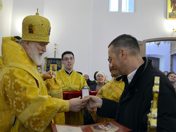 Патриарший Экзарх поздравил всех причастников с принятием Святых Христовых Таин и на память о совместной молитве подарил приходу образ святителя Кирилла, епископа Туровского.