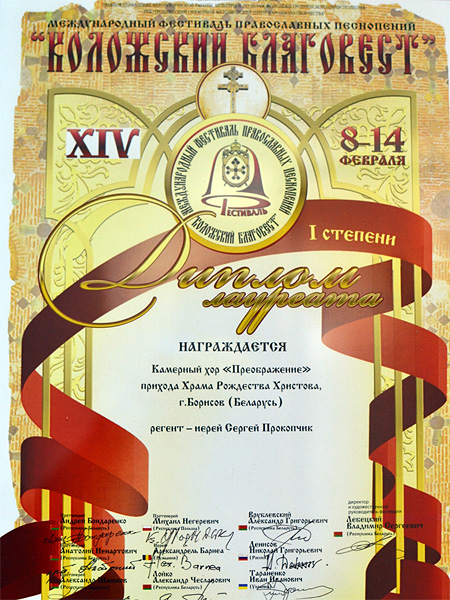 Настоящим праздником для всех стал XIV Международный фестиваль православных песнопений «Коложский Благовест», который проходил в Гродно с 8 по 14 февраля 2015 г. К участию в конкурсе, по предварительному прослушиванию, допускались только самые достойные коллективы, и каждый был оригинален и неповторим. В этом году свои творческие программы представили 39 коллективов из Беларуси, России, Польши, Литвы, Румынии. Впервые свое мастерство демонстрировали хоры из Грузии и Молдовы.