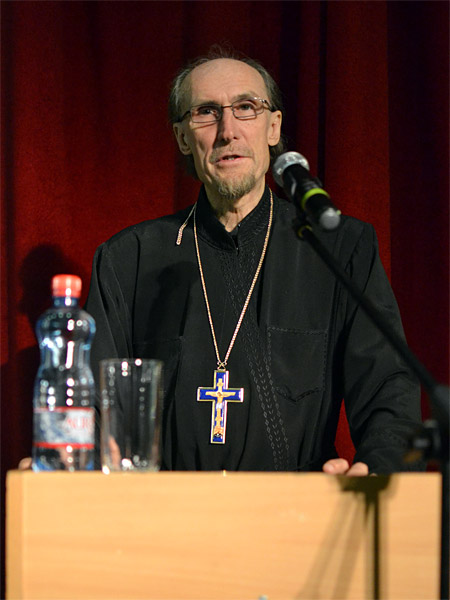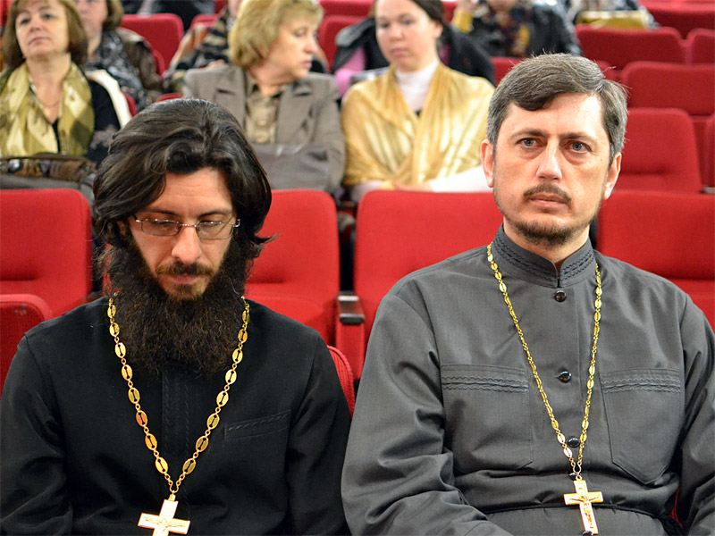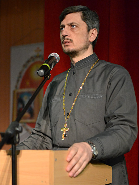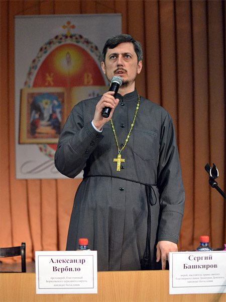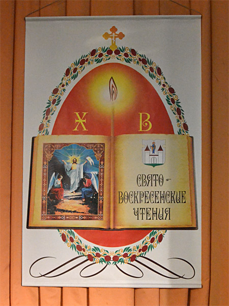 По благословению епископа Борисовского Вениамина и от его имени участников чтений поздравил благочинный Борисовского церковного округа, настоятель прихода храма Рождества Христова, кандидат богословия, протоиерей Александр Вербило. В своем выступлении отец Александр напомнил слушателям, что в течение марта-апреля в городе, районе и в целом в Борисовском благочинии проходили мероприятия, посвященные Дню православной книги, главным из которых была передача городу издательством Белорусского Экзархата факсимильного издания Слуцкого Евангелия. Готовясь к Свято-Воскресенским чтениям, сказал благочинный, мы решили даже чисто внешне связать их с праздником православной книги. По инициативе отца Сергия был разработан логотип этих чтений. В нем есть пасхальная символика (пасхальное яйцо), раскрытая православная книга, где мы видим иконографическое изображение праздника Пасхи, и герб нашего города, то есть, здесь, как бы подчеркивается, что эти чтения именно Борисовские. Он пожелал всем плодотворной работы, душевного восприятия всего услышанного.
