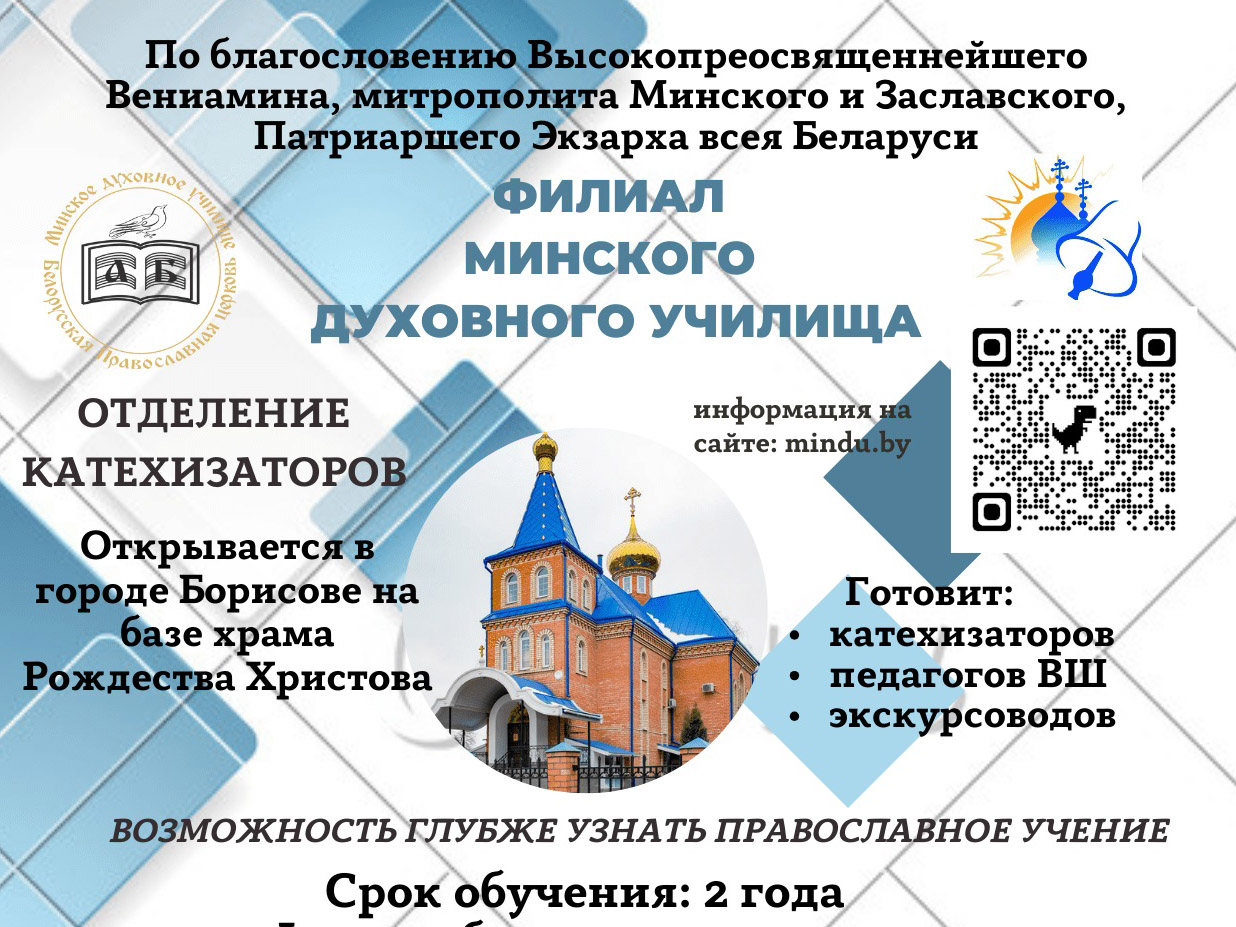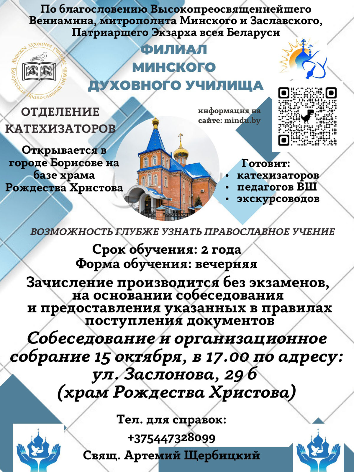 По благословению Митрополита Минского и Заславского Вениамина, Патриаршего Экзарха всея Беларуси, управляющего Борисовской епархией, на базе прихода храма Рождества Христова г. Борисова открывается отделение катехизаторов филиала Минского духовного училища.