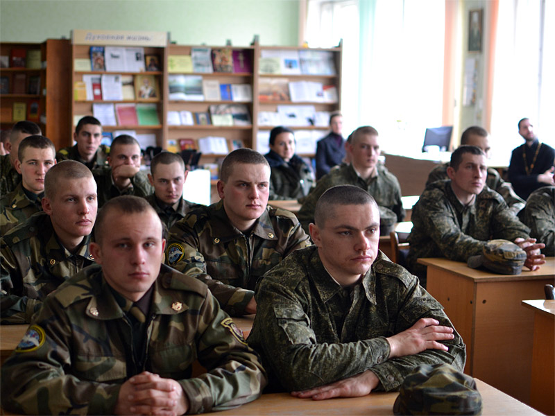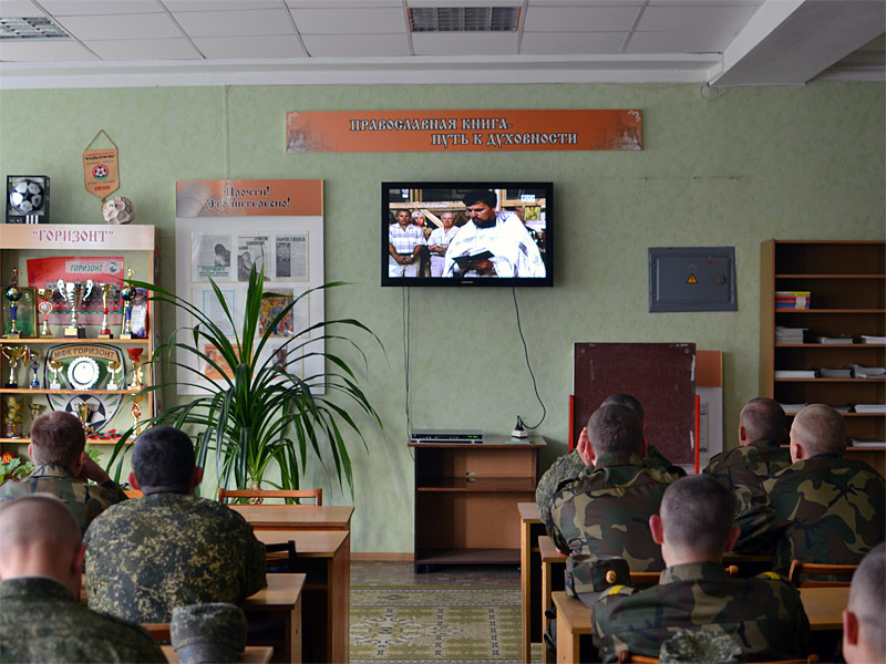Нынешнее мероприятие получило название «Воины духа». Именно такой фильм перед началом встречи со священником прихода храма Рождества Христова Евгением Швабом посмотрели солдаты и сержанты одной из частей, расположенной в Лядище. Фильм посвящен военному духовенству, верой и правдой служившему в русской армии в прежние годы и столетия, и возрождению его в современных российских Вооруженных Силах.
